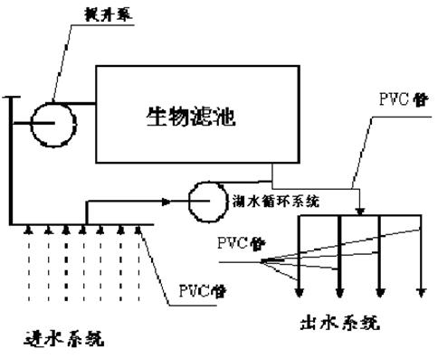 运用“F.F”吸附过滤材料的整个处理系统流程见图1,该流程除了脱氮除磷功能之外,还有湖水循环功能。