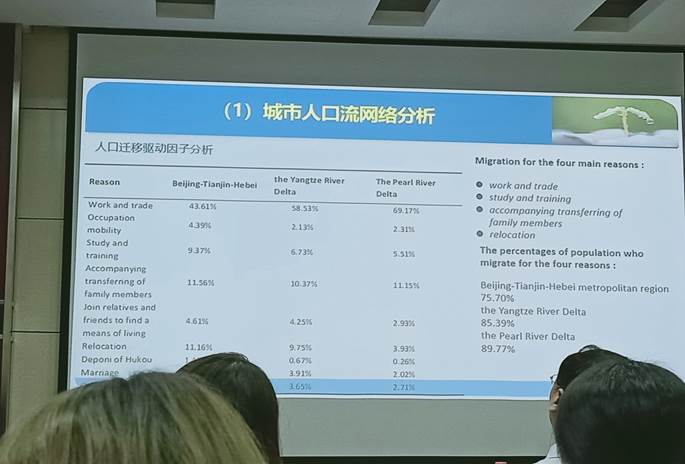遵循这样一个思路,何建华还介绍了在城市空间增长过程的建模分析。通过对城市人口流网络分析进行讲解,他使参会同学了解到,人们对于迁移的意愿程度以及主要的驱动因子、基于城市要素流分析的城市网络化与人口流动引导的城市网络化空间增长模拟等问题。