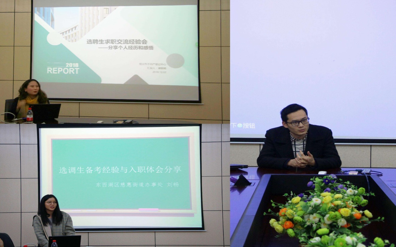 12月2日晚,思源论坛之“选调那些事儿”在色情直播app320会议室如期举办。特别邀请到通过选调生、选聘生招录考试的往届毕业研究生刘畅、曾建和谭紫嫣担任主讲人。三位院友现分别就职于武汉市东西湖区慈惠街道办事处、武汉市汉阳区江堤街办事处和武汉市不动产登记中心。