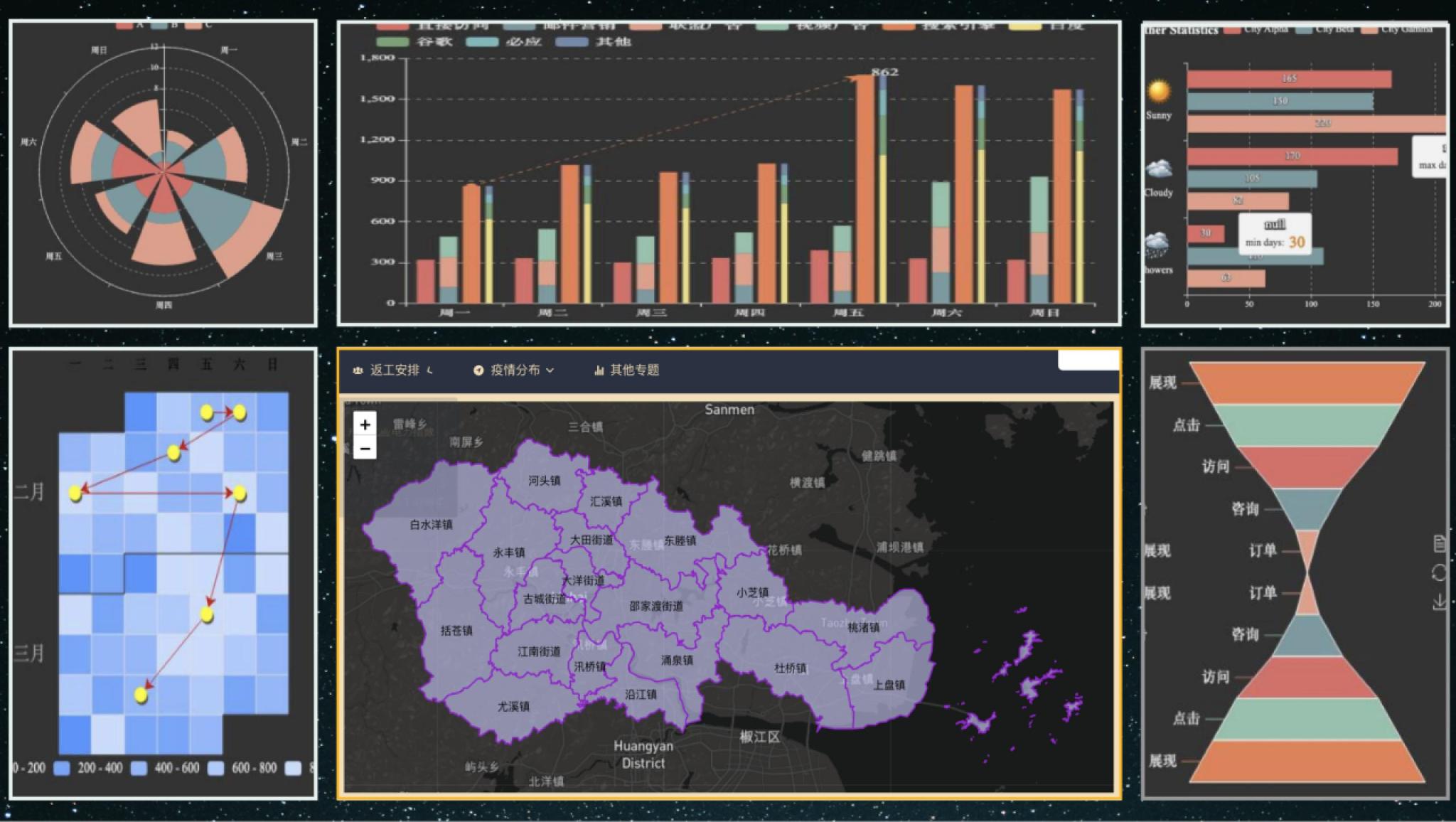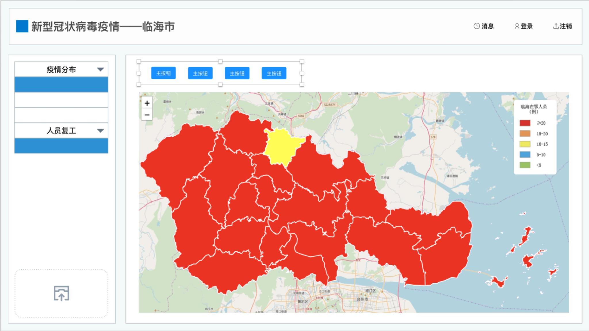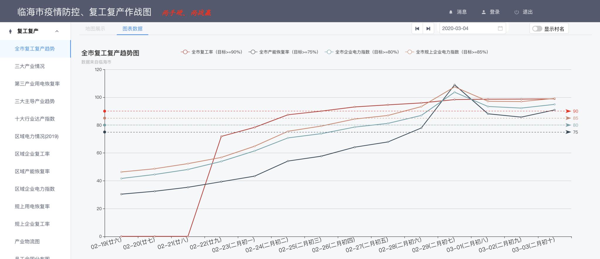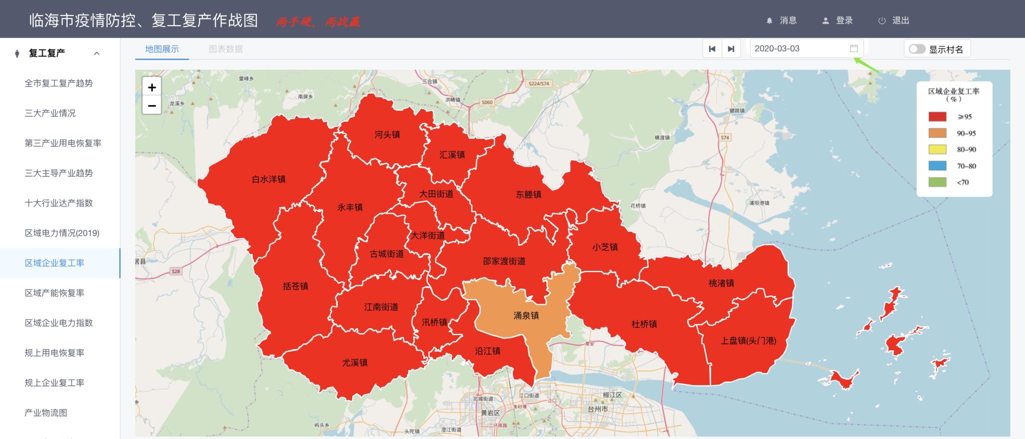疫情就是命令,复工复产就是责任。随着疫情发展趋势逐渐好转,浙江省将复工复产工作放到了首位,随后提出了“以复工复产为主,但绝不可松懈疫情监控”的要求。新要求产生了新需求:将历史数据保留并随时查看,在此基础上进行实时更新”。开发小组立刻进行了第二轮讨论和优化,将电子地图重心从疫情防控图转移到复工复产图,研发了“地图为主,图表为辅”的全方位、全周期、全数据的展示功能。在抗疫地图的支持下,临海市委市政府信息中心能够将疫情数据,复工复产数据进行实时更新、动态展示,历史查询等,让政府决策者一目了然。