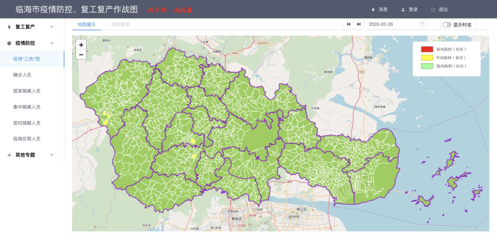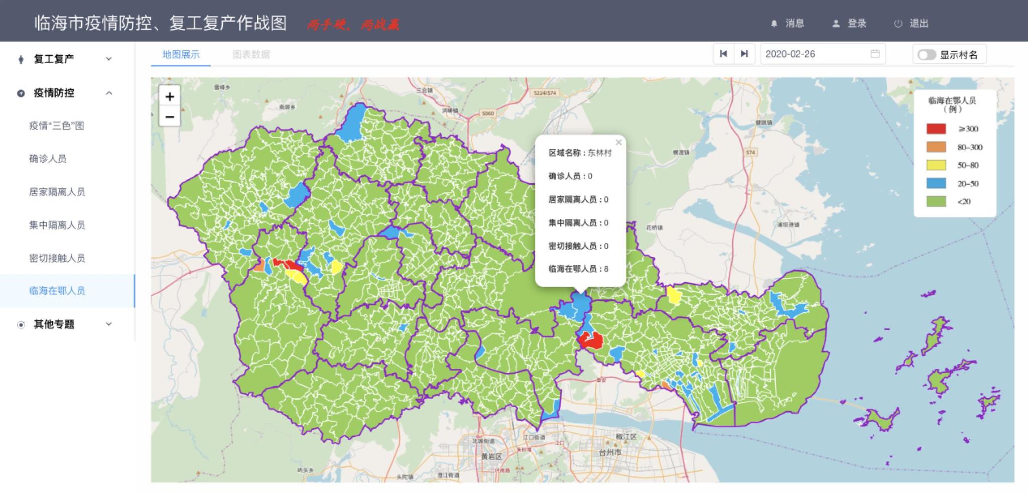 与网上许多在线地图不同,临海市抗疫地图将农村疫情作为重点表达对象,其中疫情防控、复工复产作战图的制图对象十分精细,符号表达要遵从浙江省疫情五色制图规范,疫情信息从乡镇到行政村有上百个行政单位需要全部“落地”到位,并详细展示数据细节,这才能充分体现了政府“疫情的防控短板在农村,加强农村疫情防控”的工作要求。该系统是目前最早做到村镇级别的疫情地图之一。