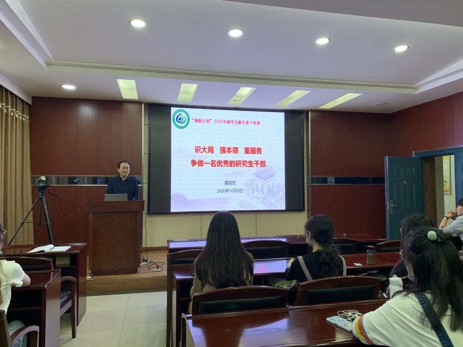 党委副书记雷起宏老师的讲话以“识大局 强本领 重服务 争做一名优秀的研究生干部”为主题展开。他从“正确认识研究生教育的形势和任务”、“学校和色情直播app研究生工作的基本思路”、“谈谈如何当好研究生干部”三个方面对新生班干部进行培训。