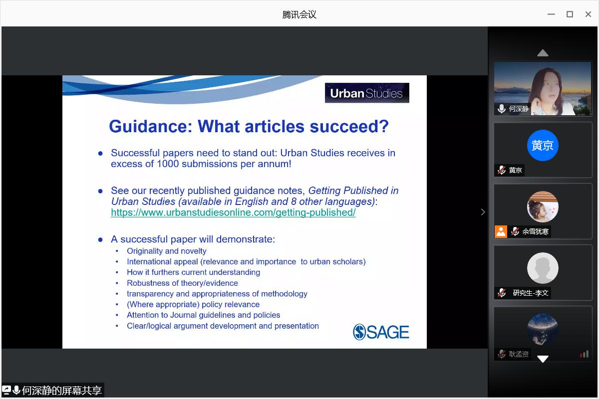 最后何教授从编辑的视角为我们介绍了《Urban Studies》的杂志情况及投稿技巧,重点强调了投稿字数、投稿过程、以及针对中国学者的培训计划等方面内容。