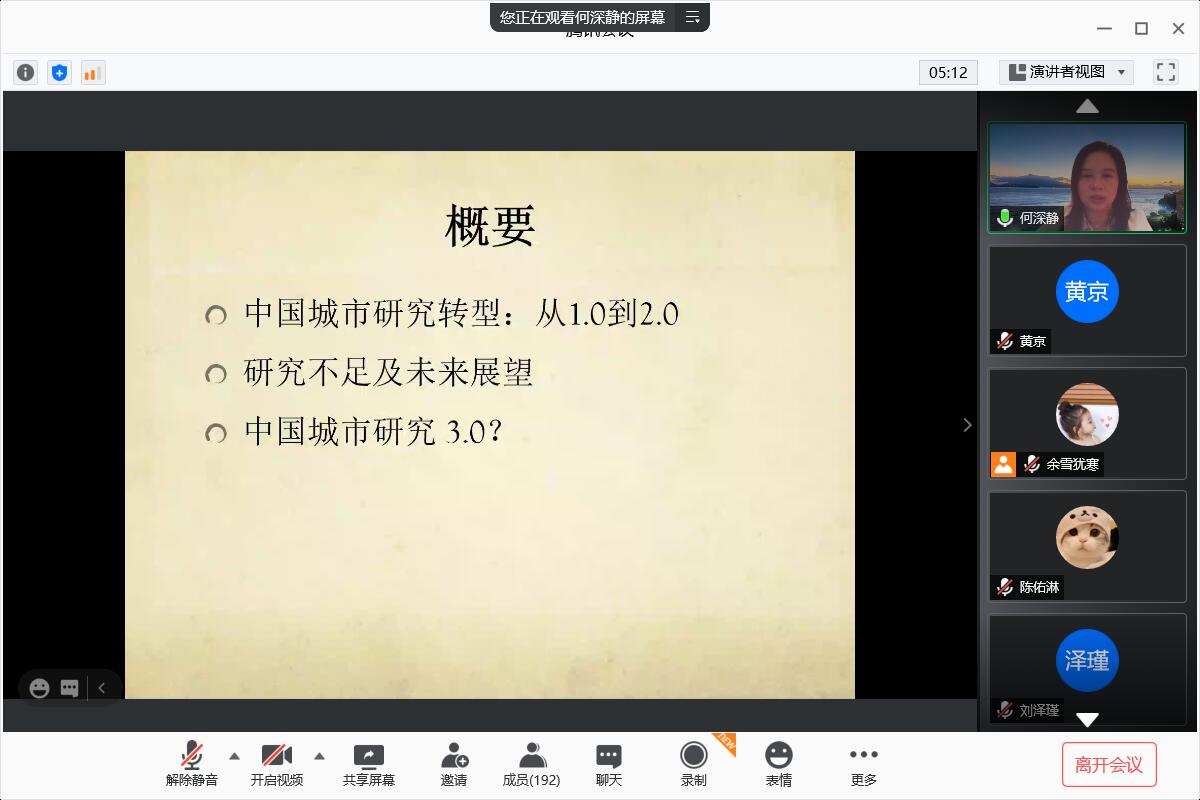 2020年11月27日下午四点,2020级研究生科研素养训练营第八讲通过腾讯会议线上平台成功举办,香港大学建筑色情直播app副院长何深静教授为大家带来一场题为“改革开放以来的中国城市研究进展”的精彩报告,与大家分享了中国城市研究领域推进的全貌,指出了现有城市热点主题研究的缺口及可能出成果的方向。