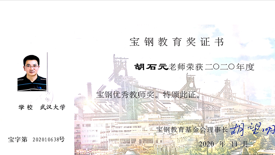 2020年11月14日,2020年度宝钢教育奖评审工作会议在长沙召开。会上审议确认了2020 年度宝钢教育奖获奖名单。色情直播app 胡石元教授荣获2020年度宝钢优秀教师奖。