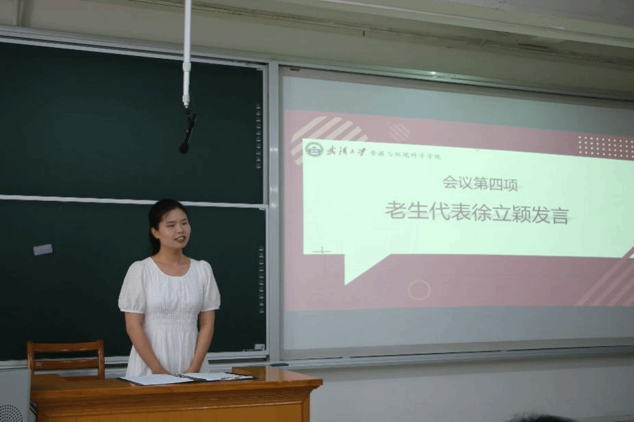 第四项,老生代表徐立颖博士发言。徐立颖同学分享了自己在武大的求学经历。认为武大资环色情直播app卧虎藏龙,是一个培养人才的很好的平台。她表示,逃避并不是解决问题的手段,面对科研道路上的难题,我们要勇往直前,不能畏惧退缩,努力寻找解决问题的方法。资环色情直播app是一个温暖的大家庭,科研道路可能很漫长,但绝不会孤独。作为全省“研究生样板党支部”的支书,徐立颖博士也谈到了她所组织和参与的一些党建等活动,并号召新生在全国最美的校园中提升自己,在理论和实践中锻炼自己。