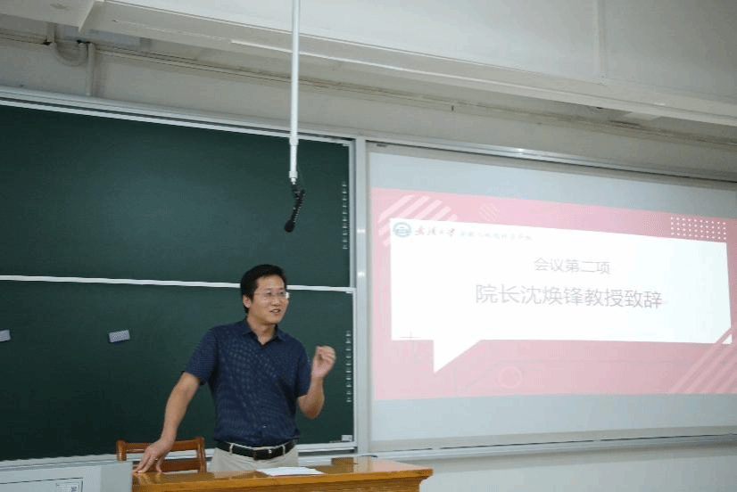 在奏唱国歌之后,院长沈焕锋教授致辞。首先,沈院长对新生的到来表示热烈欢迎。沈院长说,研究生生涯是个充满挑战和机遇的阶段,也是大家未来学术和职业生涯的关键时期。沈院长肯定研究生新生已经在众多的本科同学中脱颖而出,未来仍要过五关斩六将。沈院长勉励新生要攻克求学道路的这五大关卡。一是文献关,加强阅读文献的能力,为科研打下坚实基础;二是创新关,从一次次失败中取得成功是必不可少的一环;三是写作关,加强中英论文的写作能力,规范用语,强调中文逻辑规范;四是交流关,处理好与导师、同学、同行之间的关系,强调团结协作的重要性;五是演讲关,提高自己的语言表达能力。最后,希望同学们在武大不断成长、学习和发展,为解决当今全球面临的资源和环境挑战作出贡献!
