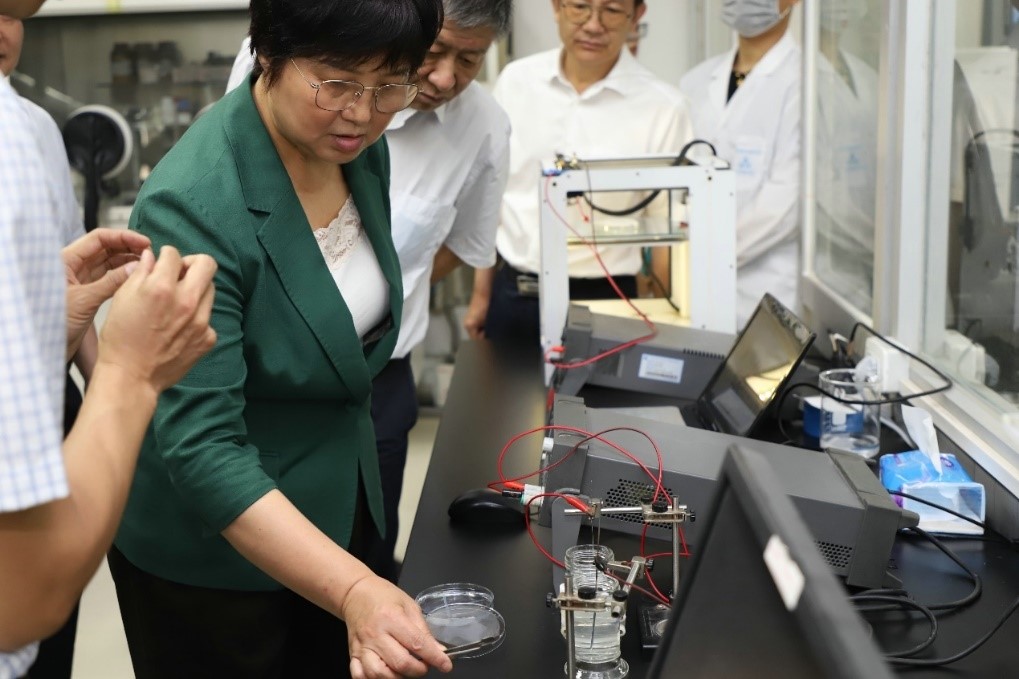王玲在色情直播app 参观了甲壳素研究开发中心和生物质资源化学与环境生物技术湖北重点实验室,观看了壳聚糖电沉积、3D电书写、静电纺丝等新技术演示,参观了实验检测平台,重点观摩了甲壳素及壳聚糖衍生物、复合物样品展示。杜予民教授、施晓文教授、邓红兵教授作相关讲解和演示。