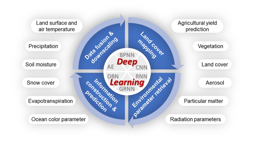 该论文首次系统性地剖析了深度学习在环境遥感中的应用现状与应用潜力,主要内容包括:1)凝练了深度学习在环境遥感领域的主要应用方向,包括土地覆盖制图、定量参数反演、数据融合与降尺度、信息重建与预测等;2)归纳并分析了遥感应用中的神经网络模型,包括BP网络、自编码网络、广义回归网络、深度置信网络、卷积神经网络、循环神经网络等;3)系统总结了神经网络与深度学习技术在水-土-气-生参数获取中的应用,包括土地覆盖、植被定量参数、农作物估产、地表和大气温度、大气环境参数、降水、土壤湿度、积雪覆盖、蒸散发、辐射参数、水色遥感参数等;4)前瞻了深度学习的遥感应用潜能,包括学习模型与物理模型的结合、网络模型中地学准则的融入、迁移学习及小样本学习等。截至2021年12月30日,该论文在Web of Science累计被引160次,入选ESI热点与高被引论文。