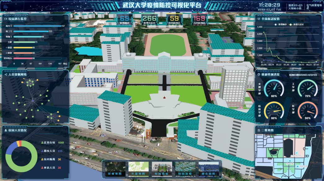 该作品立足于校园疫情防控的可视化分析平台,在构建校园三维可视化场景的基础上,借助数字孪生、可视分析和人工智能等技术,研发了校园人员密集接监测、模拟分析与信息统计发布等功能,为校园疫情防控提供决策辅助。通过有效可行的精准疫情防控措施降低防控成本,为校园师生生命健康安全保驾护航。