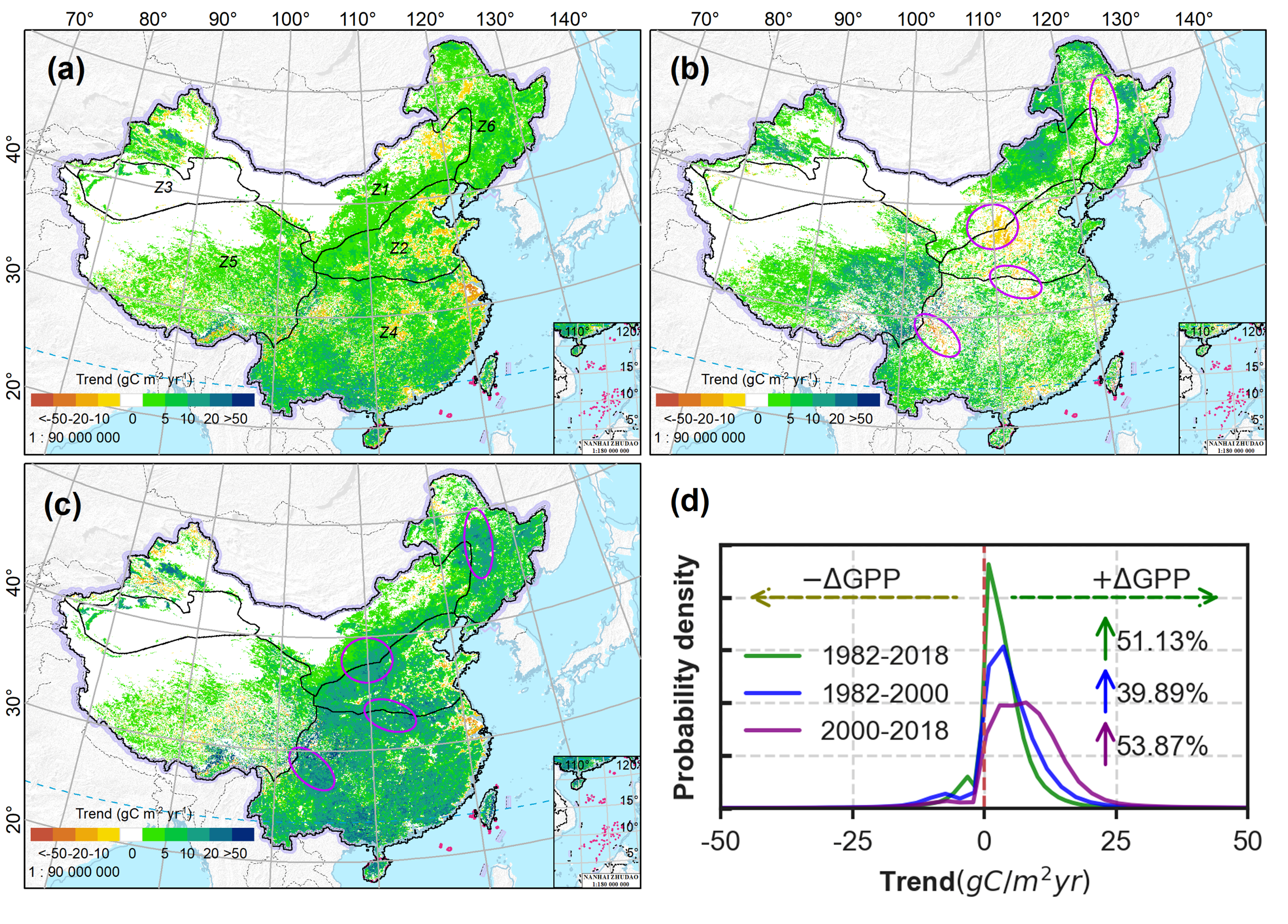 针对这一问题,本研究基于多源数据集探讨了植被总初级生产力对CO2浓度、气候变化和人为土地利用变化等多种因子的复杂响应。研究发现,在近四十年里,中国植被总初级生产力显著增强(图1)。然而,植被生产力对环境变化的响应已经从单因子主导(CO2施肥效应)时期向多个交互因子共同决定时期转变(图2),史无前例的工业化、城市化以及人为土地利用变化等对生态系统的共同影响导致了这种转变。该研究明确了这种转变在中国的区域分异及其关键制约因素。基于自然的解决方案被认为是缓解气候变化最为成熟的途径之一,该发现强调了在基于自然的解决方案中考虑综合视角和区域差异的必要性,对中国2060年碳中和目标实现具有重要意义。该研究近期以“Saturation response of enhanced vegetation productivity attributes to intricate interactions”为题发表于全球变化和生态学的国际顶级期刊Global Change Biology (IF: 13.211)。