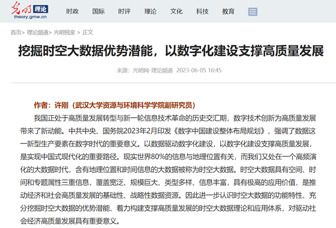 日前,色情直播app 地理科学与国土资源系许刚副研究员在《光明网》发表题为“挖掘时空大数据优势潜能,以数字化建设支撑高质量发展”理论文章。文章指出时空大数据具有空间、时间和专题属性三重信息,是支撑全空间、长时间、全方位高质量发展的基础性、战略性数据资源。文章呼吁进一步认识时空大数据的功能特性,充分挖掘时空大数据的优势潜能,着力构建支撑高质量发展的时空大数据理论和应用体系。