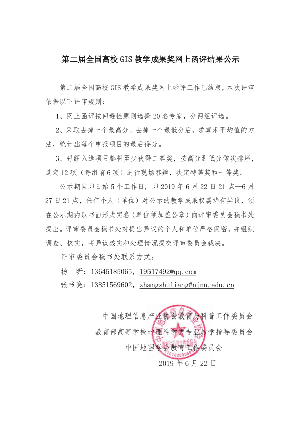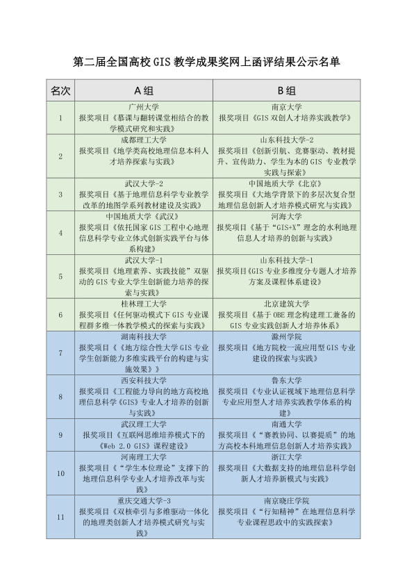 第二届全国高校GIS教学成果奖网上函评结果公示