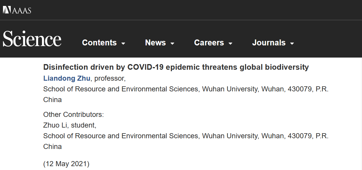 2021年5月12日,朱联东教授团队撰写的论文评述“Disinfection driven by COVID-19 epidemic threatens global biodiversity”在线刊登于Science杂志网站的eLetters平台。文章指出,新冠疫情恐惧下所导致的过度消毒或消毒剂滥用,或将威胁全球生物多样性。