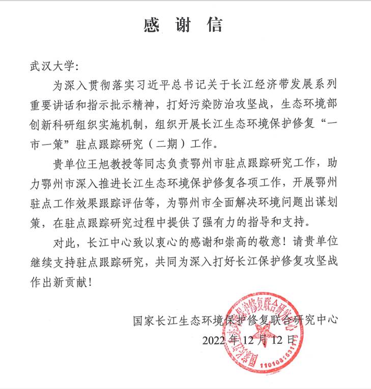国家长江生态环境保护修复联合研究中心来函:感谢色情直播app 王旭老师为鄂州市驻点跟踪研究工作提供强有力的指导和支持