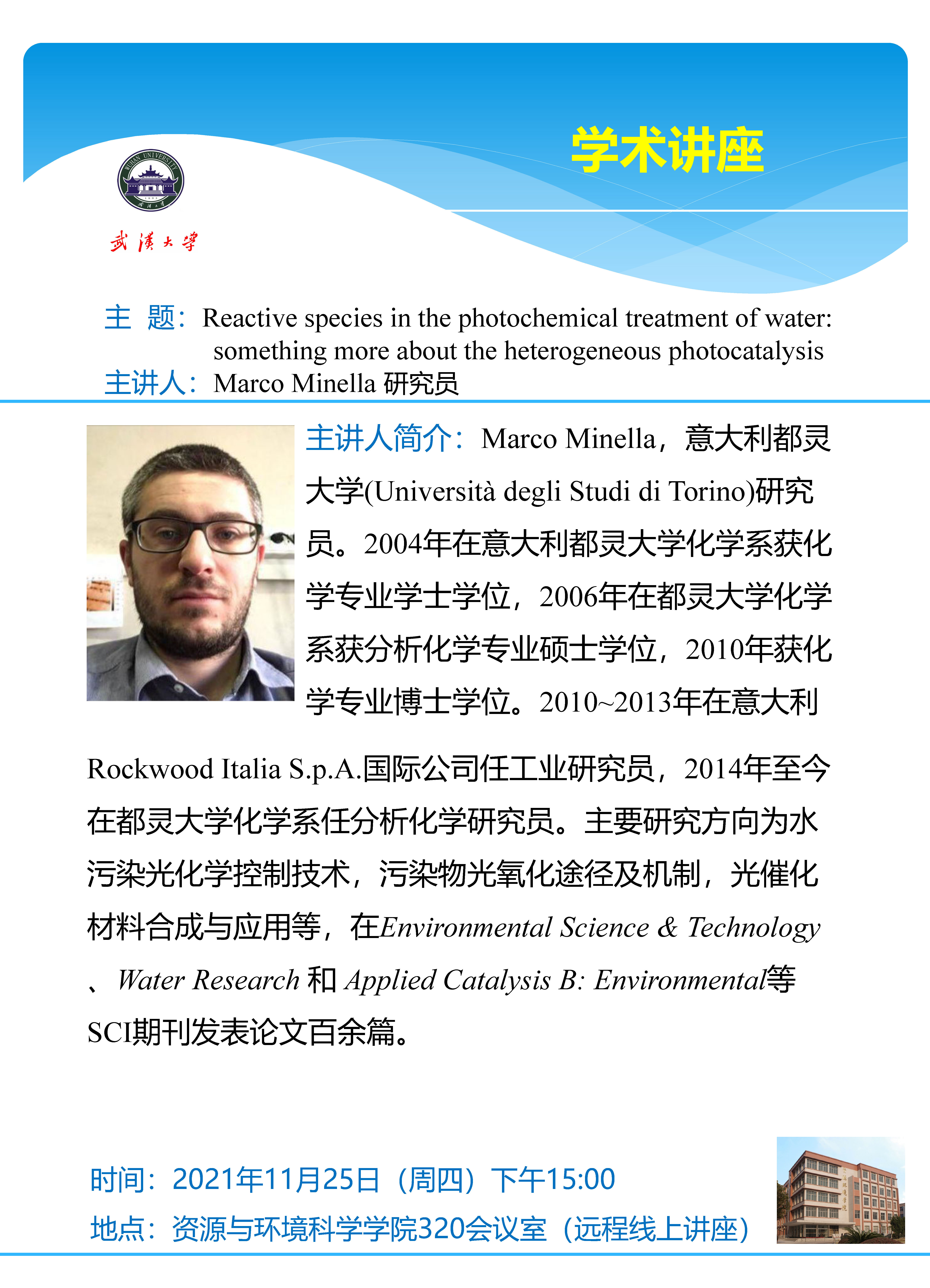 11月25日下午意大利都灵大学Marco Minella研究员:Reactive species in the photochemical treatment of water: something more about the heterogeneous photocatalysis