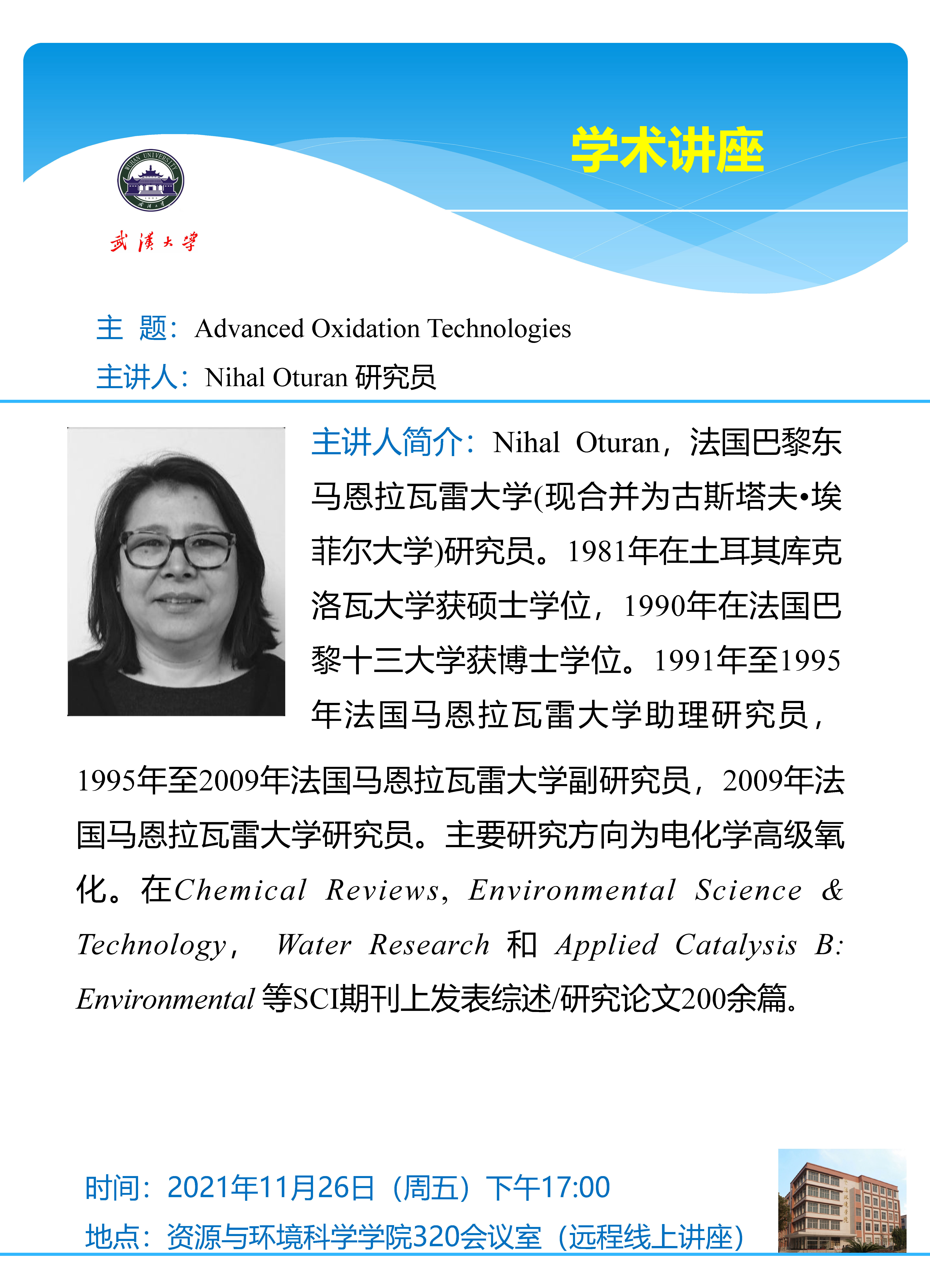 11月26日下午法国古斯塔夫•埃菲尔大学Nihal Oturan研究员:Advanced Oxidation Technologies