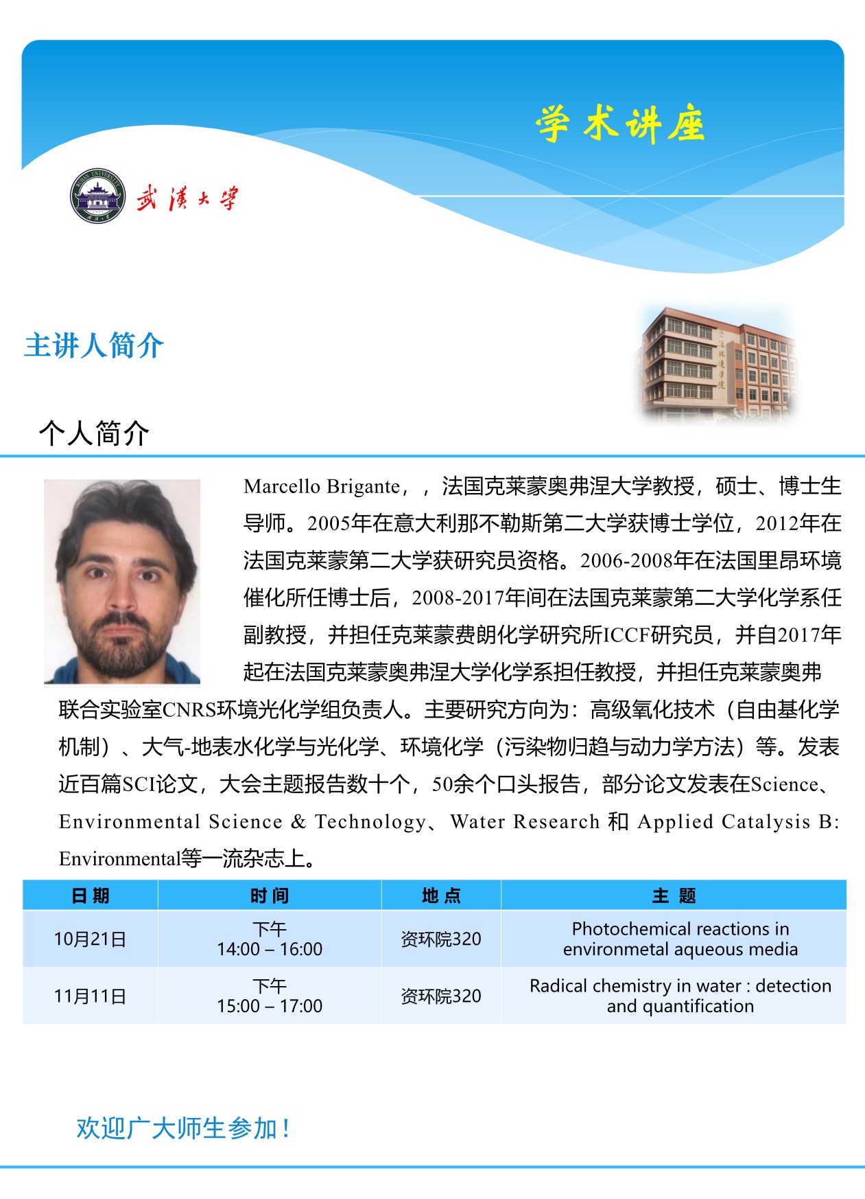 2021年10月21日至11月1日,应色情直播app 张晖教授的邀请,法国克莱蒙奥弗涅大学教授Marcello Brigante老师为色情直播app本科生开展了2次水环境中的光化学反应方面的课程讲座。