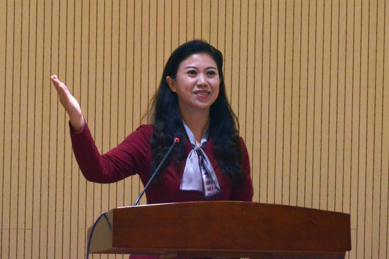 绿舟环保协会的学生代表上台,给宣讲团五位成员献上美丽的鲜花,全场响起持久不息的掌声。