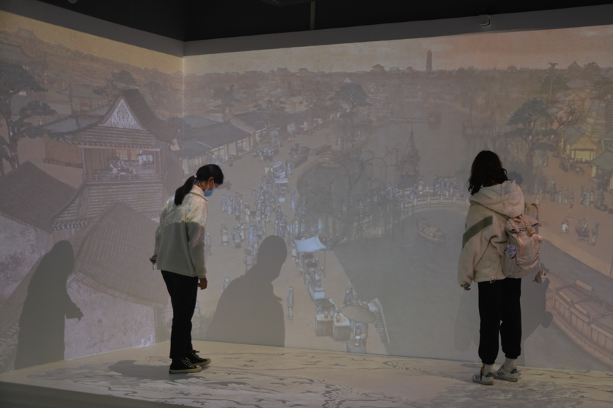 沈欣怡同学表示:“我们观看运用三维AI技术的清明上河图动态作品。先是展示画作,由远及近,我们走进了画作中的东京城。画作中原本静止的人物都活了过来。我们经过了城墙,看见马车徐徐前进,宫门那头灯火辉煌。凹陷式的设计赋予我们更鲜活的观看体验,增强了纵深感和立体感,同时该作品是可交互的,投影的地面踩过后会留下尘土绽开的痕迹……这一切都让我们对资环院的制图学问以及地图与三维AI结合的创新应用有了更深更直观的了解。”