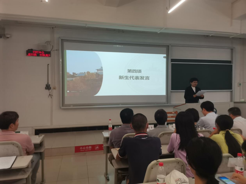 在焦利民教授发言之后,老生代表瓮梦元同学上台。瓮同学首先表给大家分享了他大学的学习生活经历,为新到来的资环学子们指引前路,他也祝愿同学们走出自己理想的大学之路,四年珞珈之约,注定是一段精彩非凡的经历。新生代表阿克波塔紧接着上台发言,与同学们共同期许前程万里,留下四年乃至更久美好的回忆。