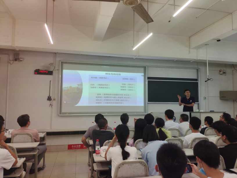 9月17日下午2:00,2022级本科新生师生见面会在信息学部一教举行。院党委书记刘兴国老师,院长沈焕锋教授,院党委副书记冯丹老师,院党委副书记马丽华老师,副院长任福教授,副院长何建华教授,副院长成海容教授,副院长孙永兴副教授,地理信息与地图科学系主任应申教授,环境科学与工程系副主任邓红兵教授,地理科学与国土资源系主任焦利民教授,22级班级导师邓博文、陈奕云老师,院学工办主任赖婧老师,院团委书记华翔老师出席了此次见面会。大会由新生辅导员孙书堂老师主持。