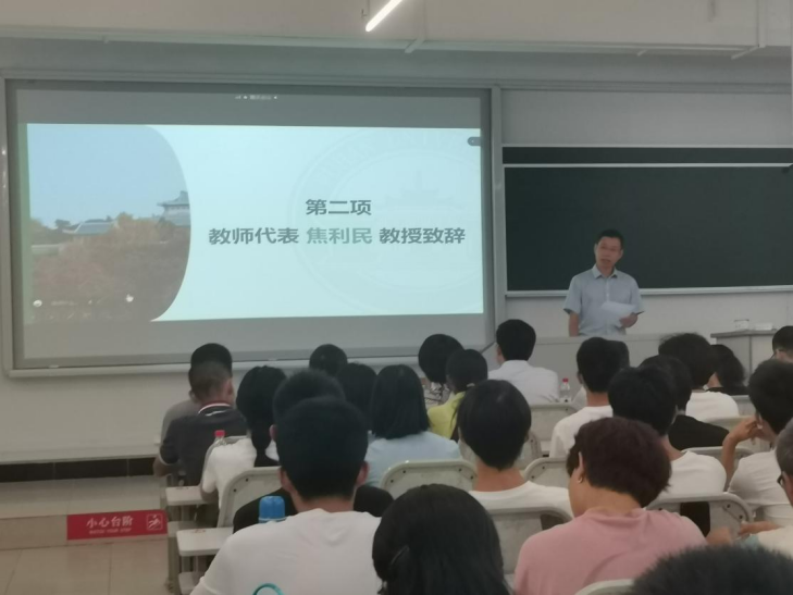 在全体与会人员坐下后,教师代表焦利民教授上台发言。焦教授向大家提出了三点期望——保持你的热情与梦想、拓宽你的视野与格局、永远不放弃努力与奋斗!焦教授也祝愿道:“希望你们在这里经历全面的成长,在色情直播app