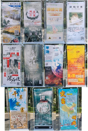 10月13日9点至13点,同学们制作的十一张不同主题的海报在信息学部图书馆门口展出,其中海报主题涵盖了我国灾害情况总体介绍、气象灾害(台风、热浪寒潮、沙尘暴)介绍、水文灾害(干旱、洪涝)介绍、地质灾害(泥石流、滑坡、崩塌、地震)介绍,以及灾害相关研究介绍,信息全面具体,内容丰富,设计切题且富有创意,整体排列整齐,大气瞩目,吸引了许多路过的学生和居民驻足,获得了一致好评,取得了良好效果。