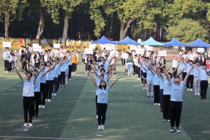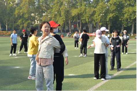 “九人十足”的比赛同样看点十足。在出发地点,各队的负责人不断地指导队友、鼓励队友。“开始!”裁判一声令下,默契的男生出左脚女生出右脚,伴着“一二一二”的口号声整齐而又快速的前进。炎热的天气下,队员们的热情却丝毫未褪。他们互相一手搭着旁边一人的肩,一手搂着身旁另一人的腰,将队友九人牢牢地团结在一起,双腿在绑带的束缚下,随着口号声,整齐地迈着。虽然中间有同学跟不上导致队伍走偏的情况,但他们都及时停下,进行调整,再重新喊口号出发。另外,还有旋转shooter、跳大绳、夹心饼干等趣味项目。临近中午,天气炎热,但同学们的呼喊声更加热烈。