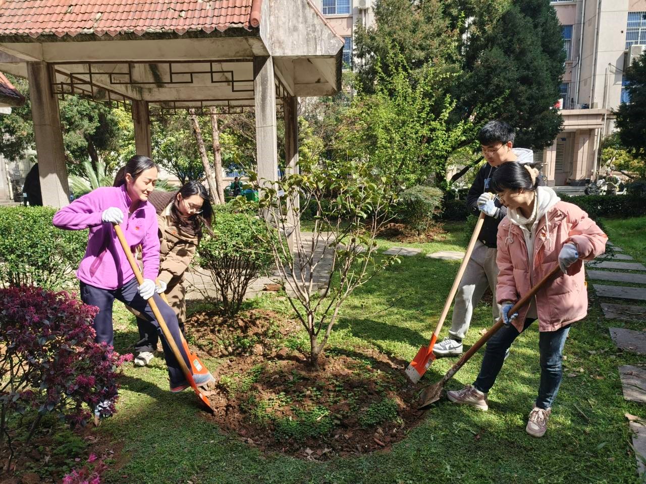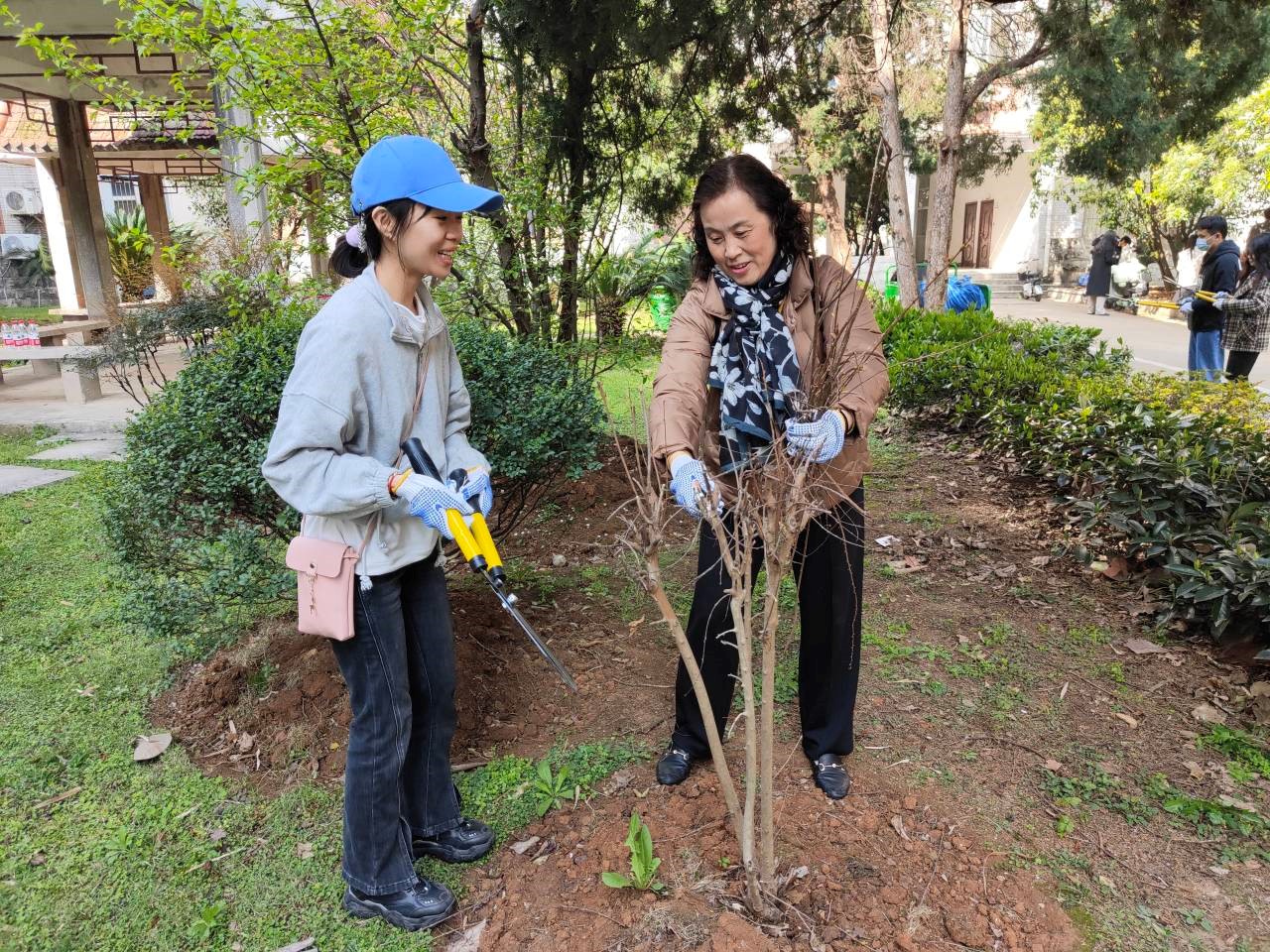 认养仪式结束后,研究生党员们在绿委办和园林中心老师们的带领下,分组开始了植被养护工作,包括清理树木旁的杂物、修剪紫薇和绿篱的枝丫、除杂草和种吉祥草。事虽小,但并不简单。清理杂物的耙子要找准方向才能快速完成清扫;修剪枝丫要水平修剪,保持灌木丛高度齐平;除杂草时铁锹要倾斜进入土壤,垂直切入阻力大,比较费力;种吉祥草需要两人默契配合,一个挖坑一个放草,节奏一致。