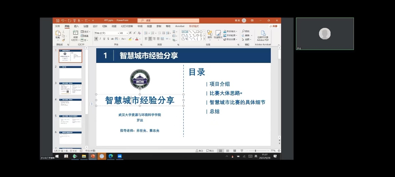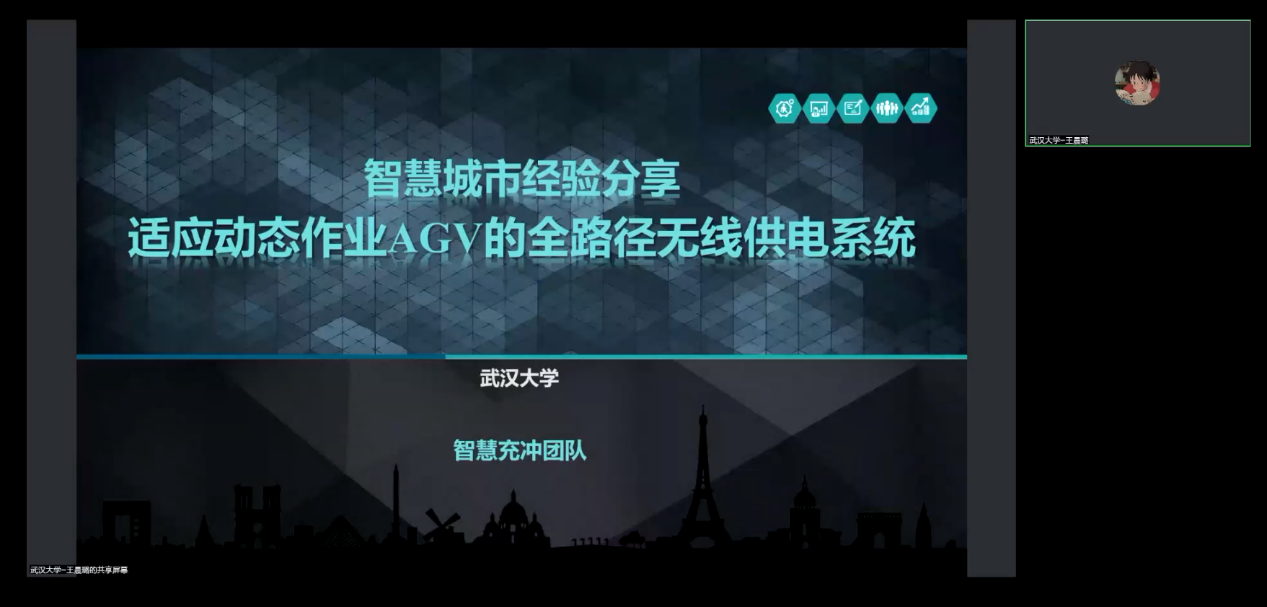 首先,智慧充冲团队王晨露同学进行了分享。智慧充冲团队在第七届智慧城市大赛中取得了全国一等奖的优异成绩。王晨露同学从前期准备、角色分工、作品意义、重难点、创新点、作品演示等方面进行了经验分享,结合视频和展示的PPT进行了详细讲解。