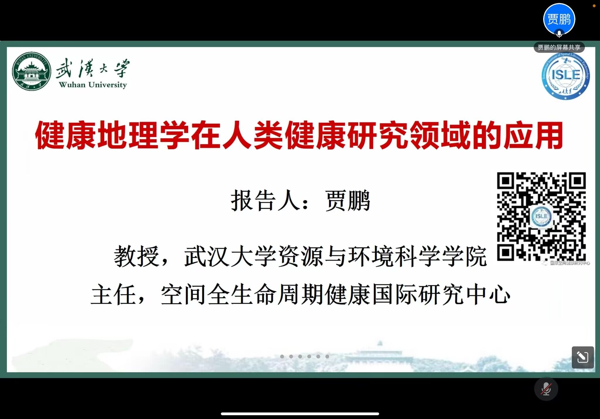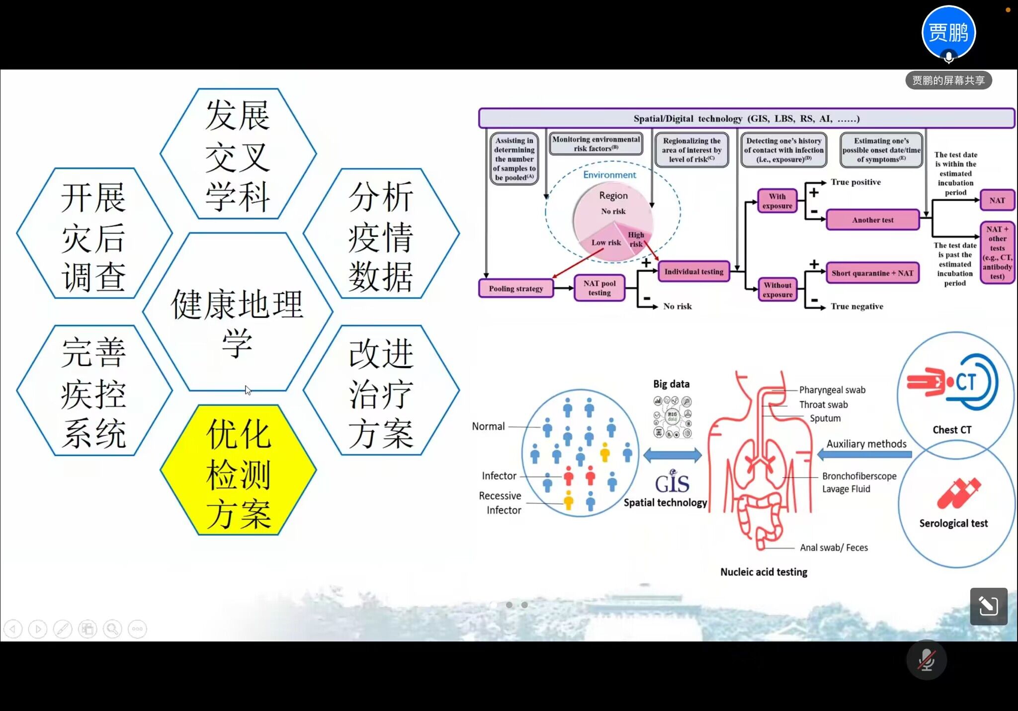 最后,贾鹏老师以新型冠状病毒疫情为例从六个方面对健康地理学进行了拓展,分别是交叉学科的发展、分析疫情数据、改进治疗方案、优化监测方案、完善疾控系统、开展灾后调查,表明健康地理学在多个方面都发挥了重要作用。