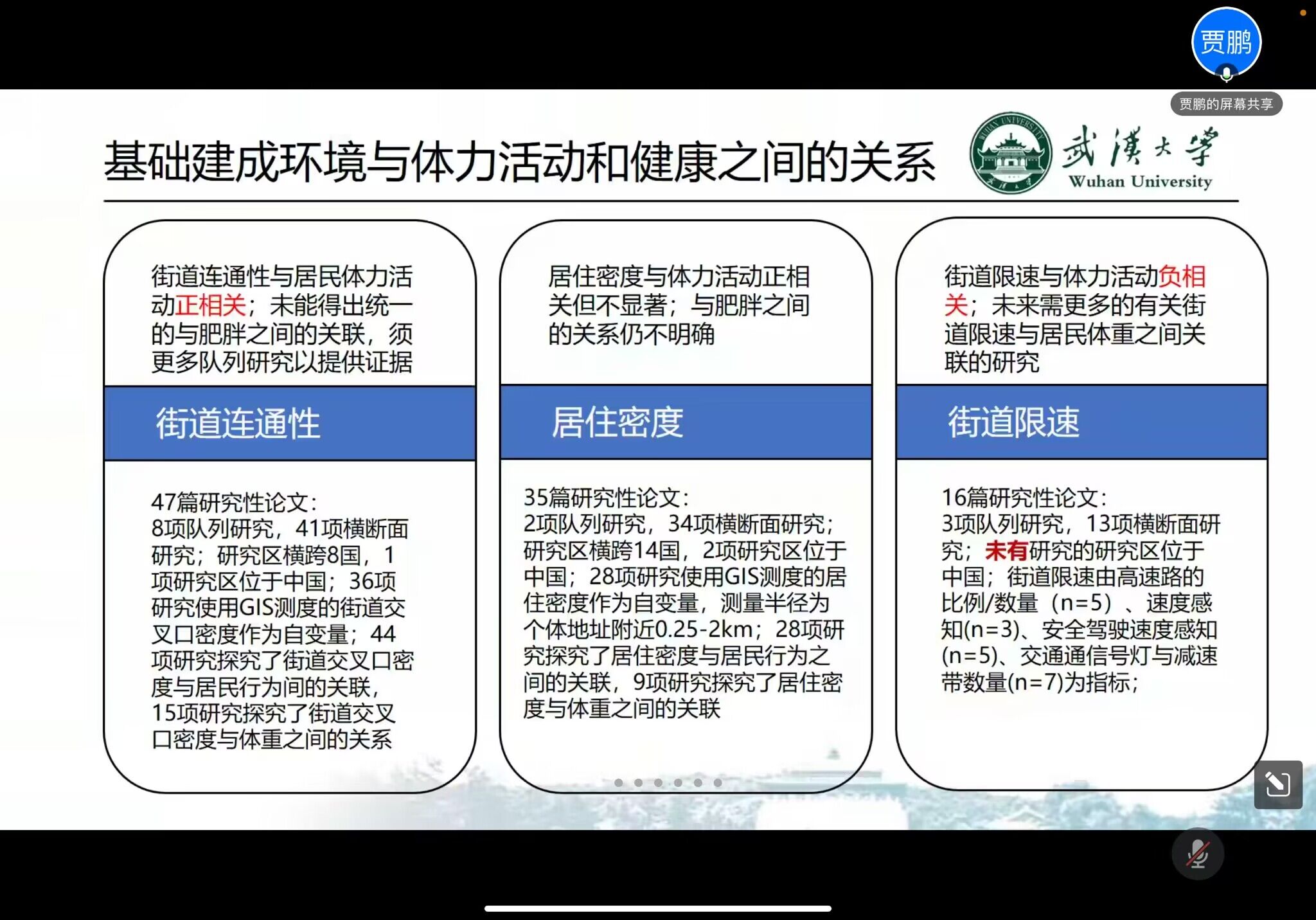 活动开始,贾鹏老师首先介绍了自己的主要研究方向和科研经历,包括空间全生命周期流行病学、慢性病的环境和行为影响因素、医疗数据和相关多源大数据分析以及新型冠状病毒疫情相关的研究。贾鹏老师希望通过分享自己的研究经历和内容,让同学们了解到不同学科领域应当结合不同的研究手段和方式进行思考和布局,并在此过程中发现问题,解决问题,寻求创新。