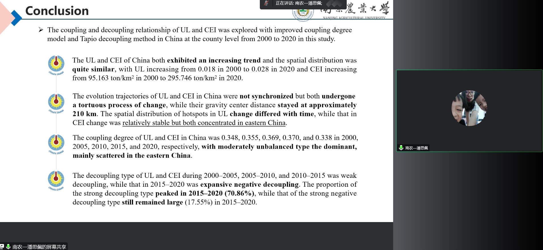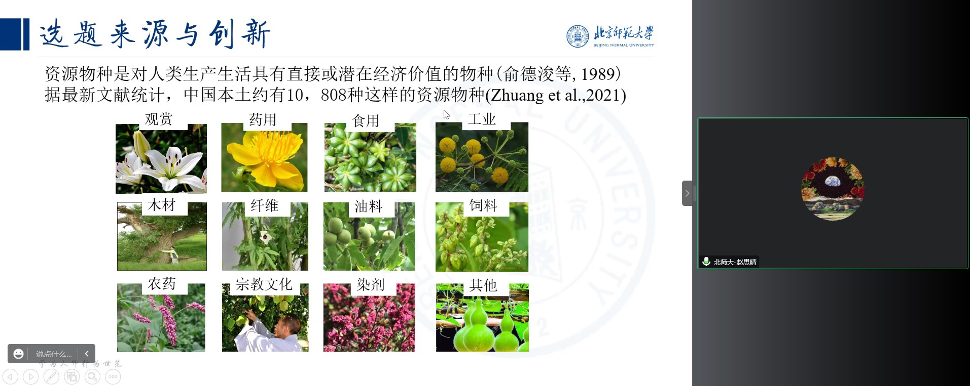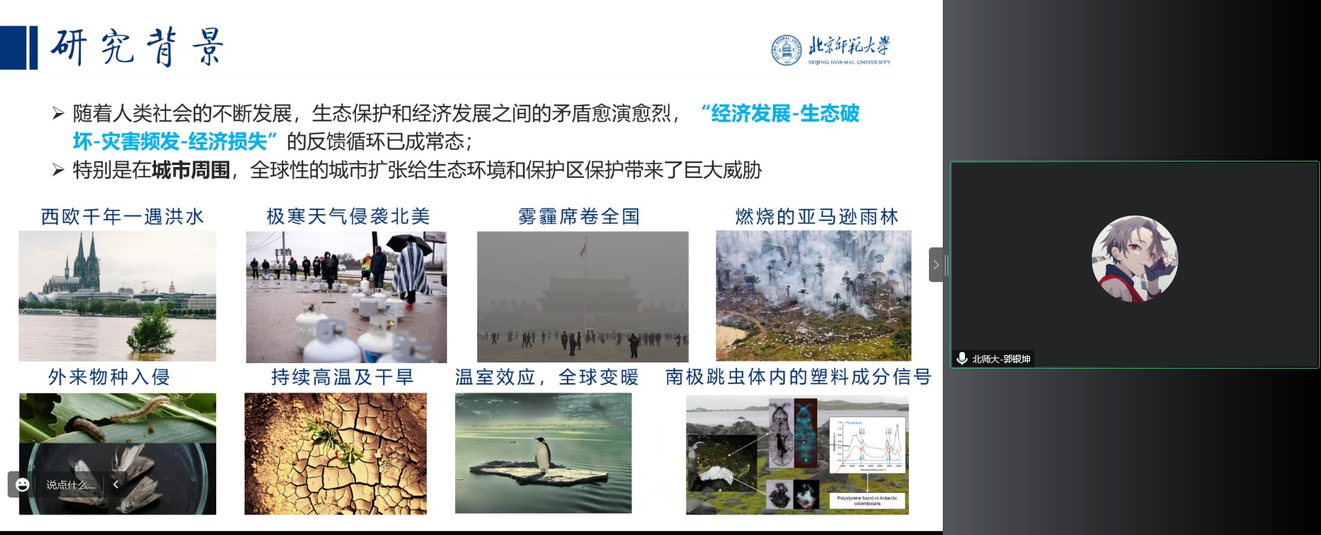 第一位带来分享的是来自南京农业大学公共管理色情直播app的潘思佩同学,探讨了中国的城市化水平和碳排放的关系,为低碳城市和双碳目标提出了相关建议;来自北京师范大学地理科学学部的张棋同学对中国自然状态气象干旱到水文干旱传递的时空特征进行了分析,提出可以通过一些指标将该传递特征进行量化,以便更准确地进行预警;来自北京师范大学地理科学学部的郭银坤同学围绕如何有效整合多源生态环境数据问题展开,提出了生态环境质量评估新指标,探究了中国京津冀、长三角和粤港澳三大城市群20年的生态环境质量变化;来自北京师范大学地理科学学部的赵思晴同学围绕中国本土维管植物的多样性保护展开,分析了具有代表性的维管植物的空间分布规律、植物多样性热点和热点受保护现状,初步探讨了如何在未保护区开展特有种的保护工作,为我国生态文明保护与可持续发展提供了相关建议。