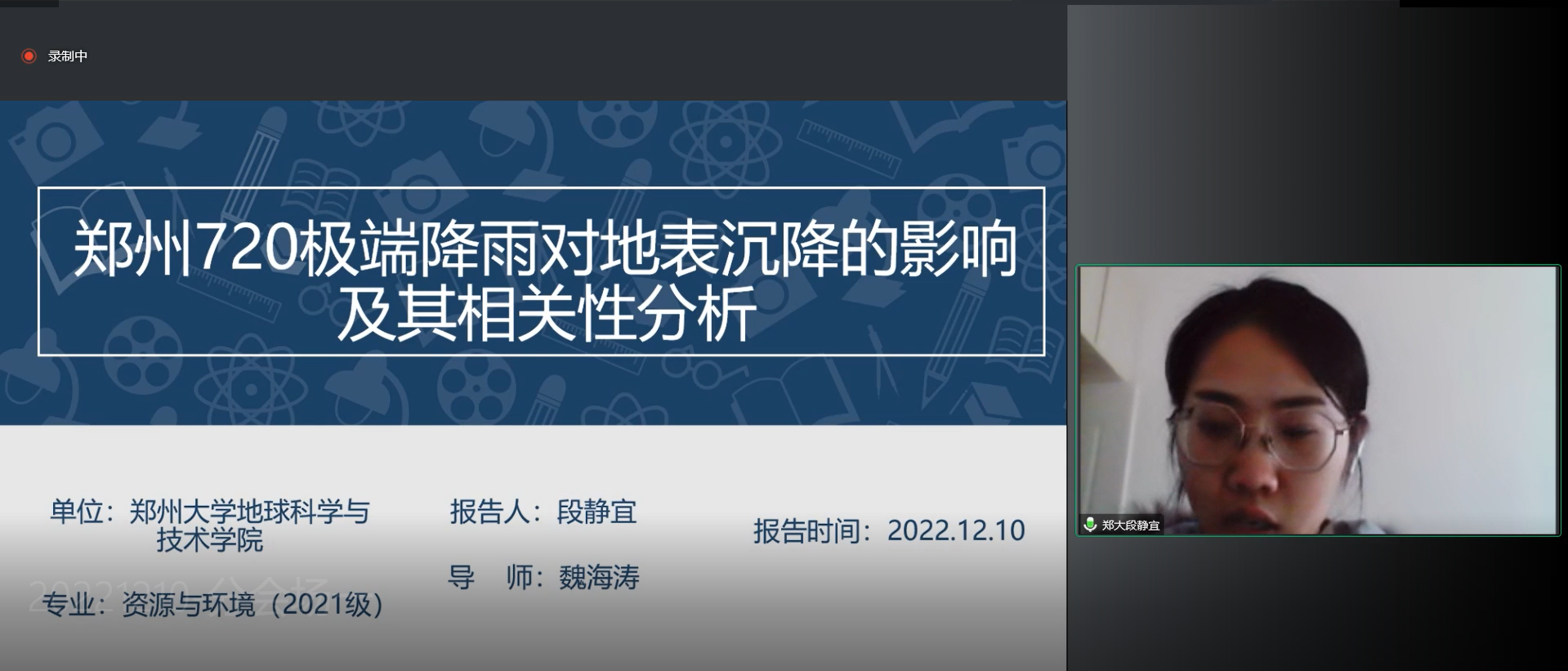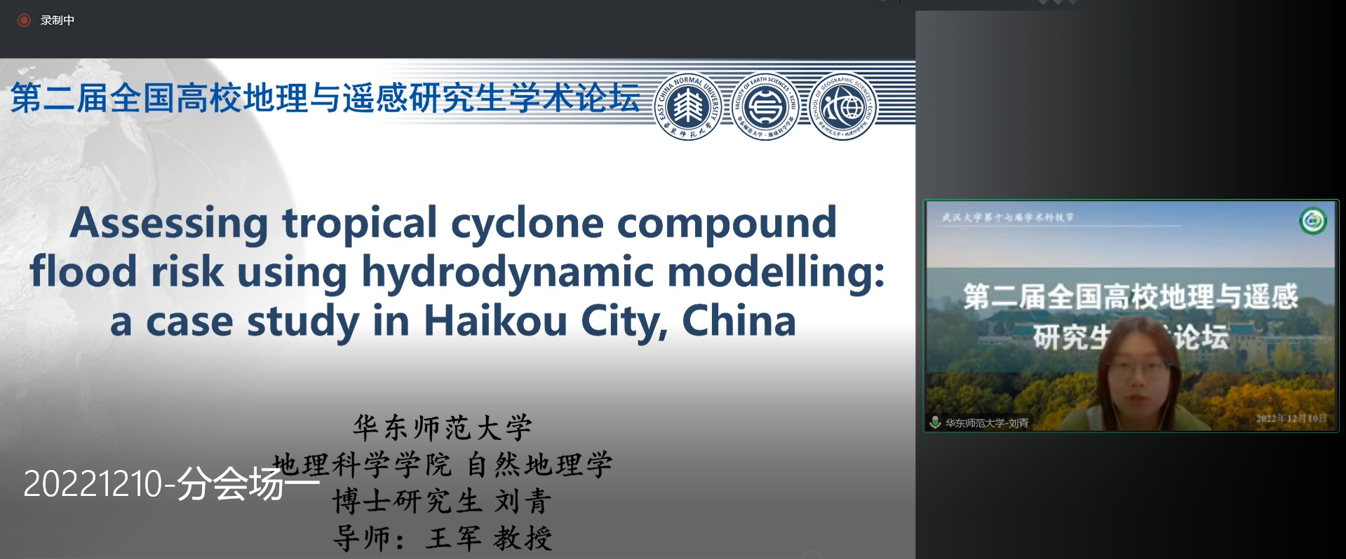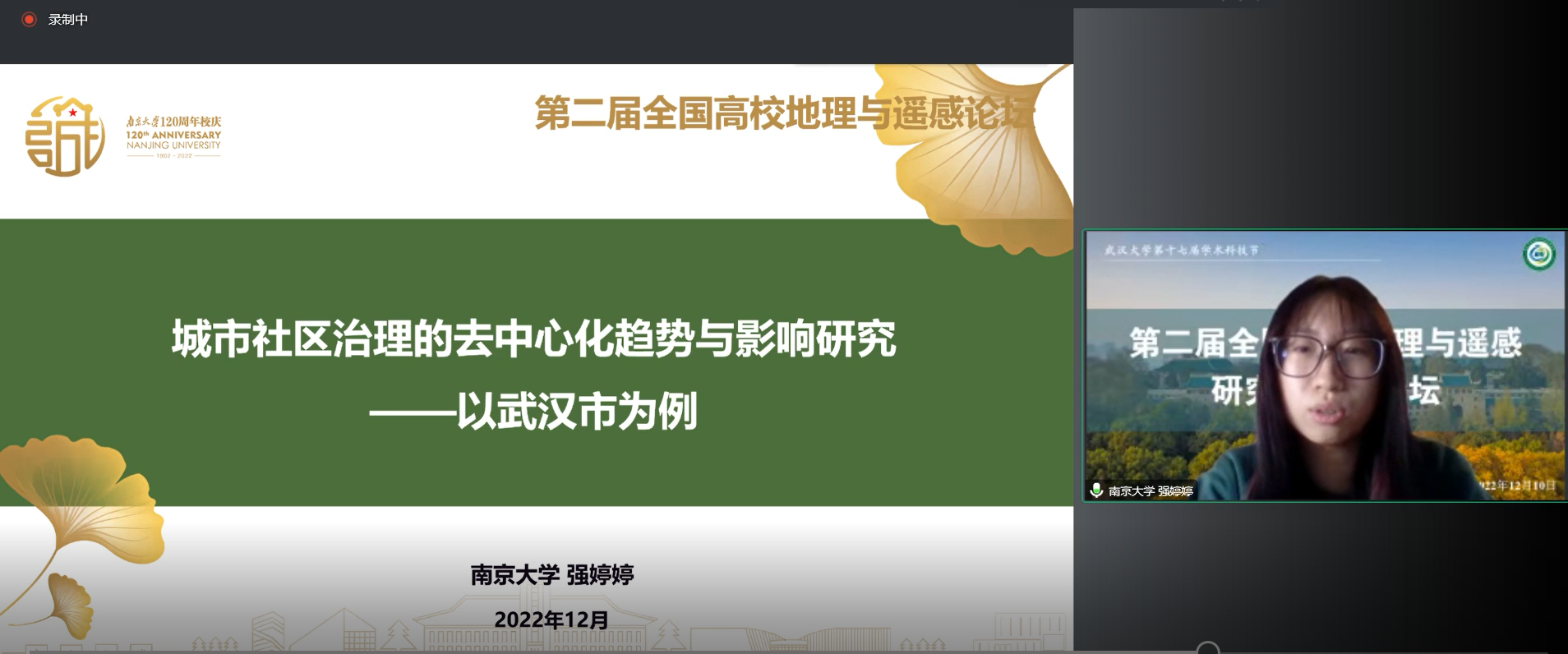 分会场四位嘉宾同学就自己的研究方向作了精彩报告。首先是来自郑州大学地球科学与技术色情直播app的段静宜同学,她的报告探讨郑州市地面沉降的时空分布特征、720暴雨与郑州市地表沉降之间的关系,并验证了时序InSAR监测结果的有效性;来自华东师范大学城市与区域科学色情直播app的杜文杰同学基于GEE平台生产了一套可用于监测SDG 11的不透水面时序产品,并结合地球观测和人口普查数据,使用土地利用效率指标估算了中国433个城市25年来城市化的土地、人口和经济领域之间的关系;来自华东师范大学地理科学色情直播app的刘青同学以中国海口市为例,利用流体力学模型评估热带气旋复合洪水风险,可以为预防沿海洪水的研究提供重要启示;最后一位是来自南京大学地理与海洋科学色情直播app的强婷婷同学,她以武汉市为例,研究了城市社区治理去中心化的演进过程、路径及影响,揭示了我国城市社区治理去中心化的演进过程,提出了社区治理去中心化的两条实现路径,并基于“武汉城市留言板”数据检验去中心化给社区治理带来的影响。