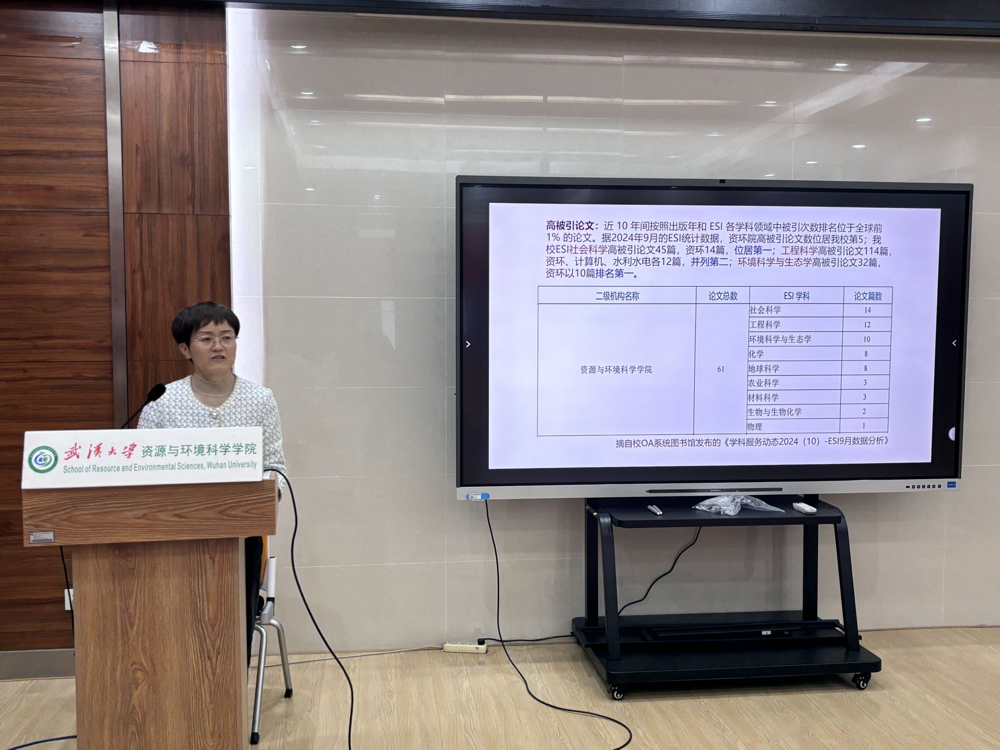 的文献资源建设情况。我校拥有丰富的文献资源,印刷型文献订购量达 732 万册,电子型文献更是达到了 1550 万册,电子资源占比逐年上升。接着,赖老师为同学们介绍了常用的数据库,包括中文数据库中的知网、万方、维普等,以及外文数据库中的 Web of Science、Scopus 等。值得一提的是,资环色情直播app的SCI 论文数量和引用数量均位于全校前列。据 2024 年 9 月的 ESI 统计数据,资环院高被引论文数位居我校第 5;我校 ESI 社会科学高被引论文 45 篇,资环 14 篇,位居第一;工程科学高被引论文 114 篇,资环、计算机、水利水电各 12 篇,并列第二;环境科学与生态学高被引论文 32 篇,资环以 10 篇排名第一。这些数据充分展示了资环色情直播app在学术研究方面的卓越成就,也为同学们树立了榜样。