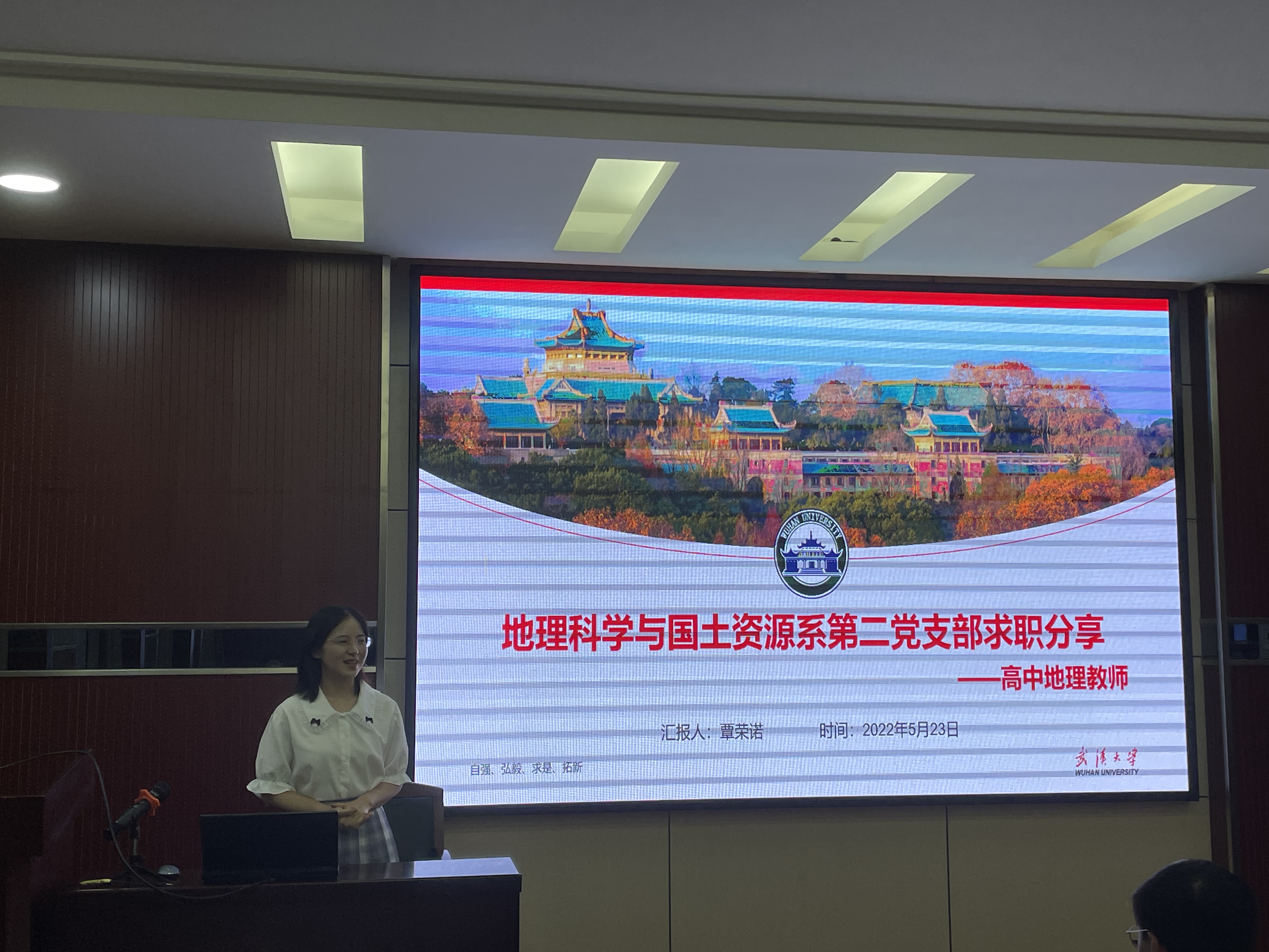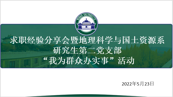 研究生会和地理科学与国土资源系研究生第二党支部联合举办的求职经验分享会暨地理科学与国土资源系研究生第二党支部“我为群众办实事”活动在资源与环境科学色情直播app220学术报告厅成功举办,活动邀请到人文地理学专业的覃荣诺、孙莹莹、杨文睿和郭向天四位师兄师姐,就求职方向的选择、求职前的准备和求职过程中的注意事项等方面向大家进行了分享。