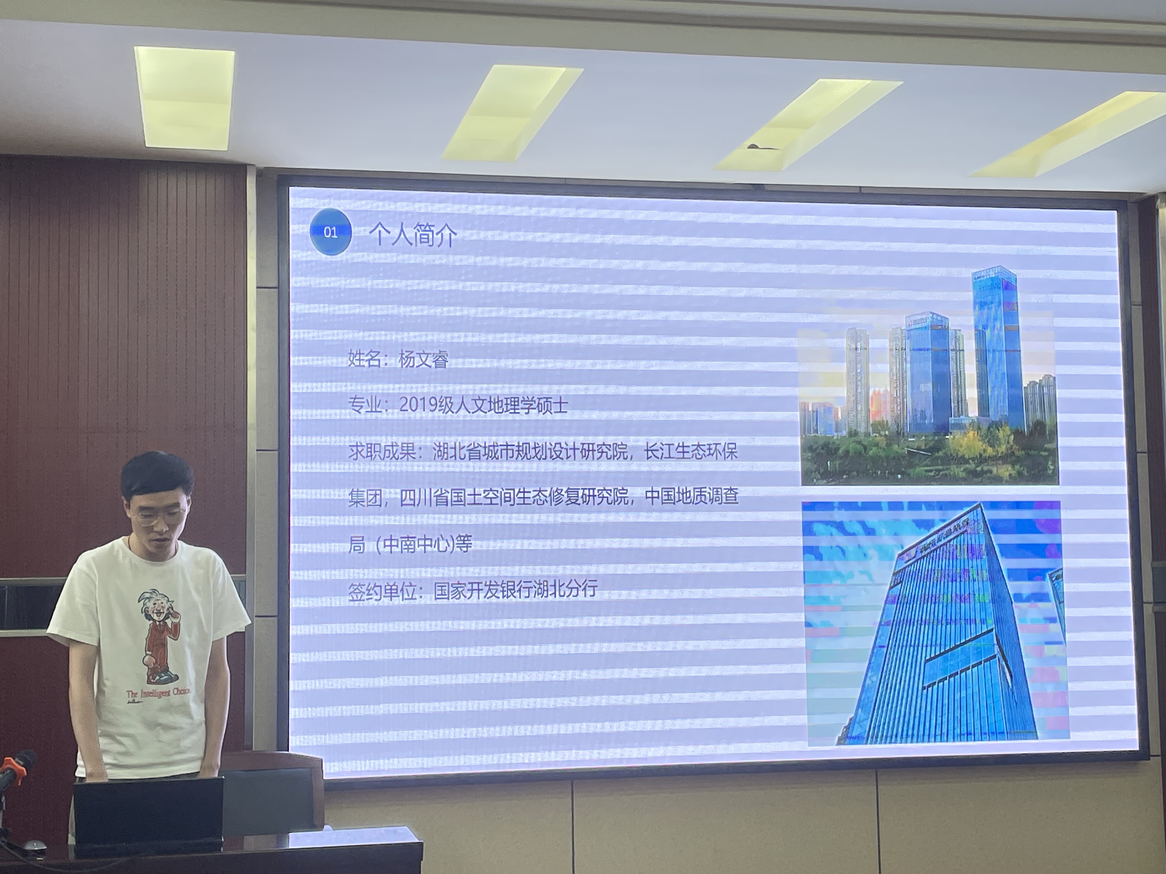紧接着,即将成为夷陵中学地理教师的覃荣诺师姐从时间节点、材料准备和面试经验三个方面展开了她的分享。师姐结合自身的经历,向大家介绍了不同地区学校的招聘情况,阐述了简历制作时的注意事项及求职时需要准备的材料,并就结构化面试、试讲及无领导小组讨论三个方面分享了她的面试经验,师姐的分享生动具体,令大家获益匪浅。
