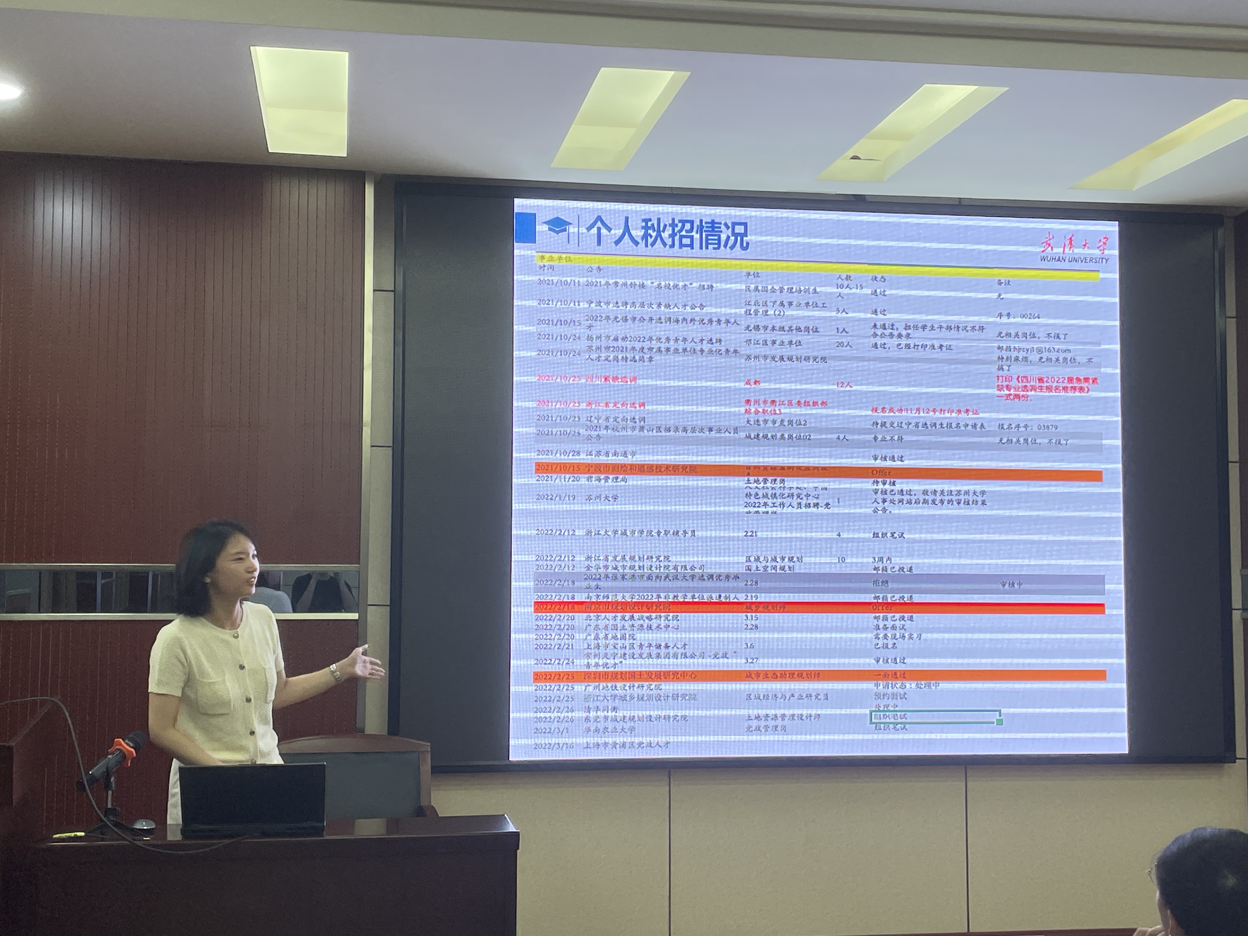 随后,孙莹莹师姐进行了她的分享。在求职过程中,她先后尝试过选调生、人才引进及规划院等多种不同类型的就业方向,最后选择了深圳市规划国土发展研究中心,师姐也将这些求职方向的重要时间节点向大家做了介绍。简历要突出个人特点,面试时态度要诚恳,选择offer时不要盲目,求职过程中保持良好的身心状态,多与身边的师兄师姐及同学沟通,这些是师姐的亲身经历,也是对于大家行之有效的建议。