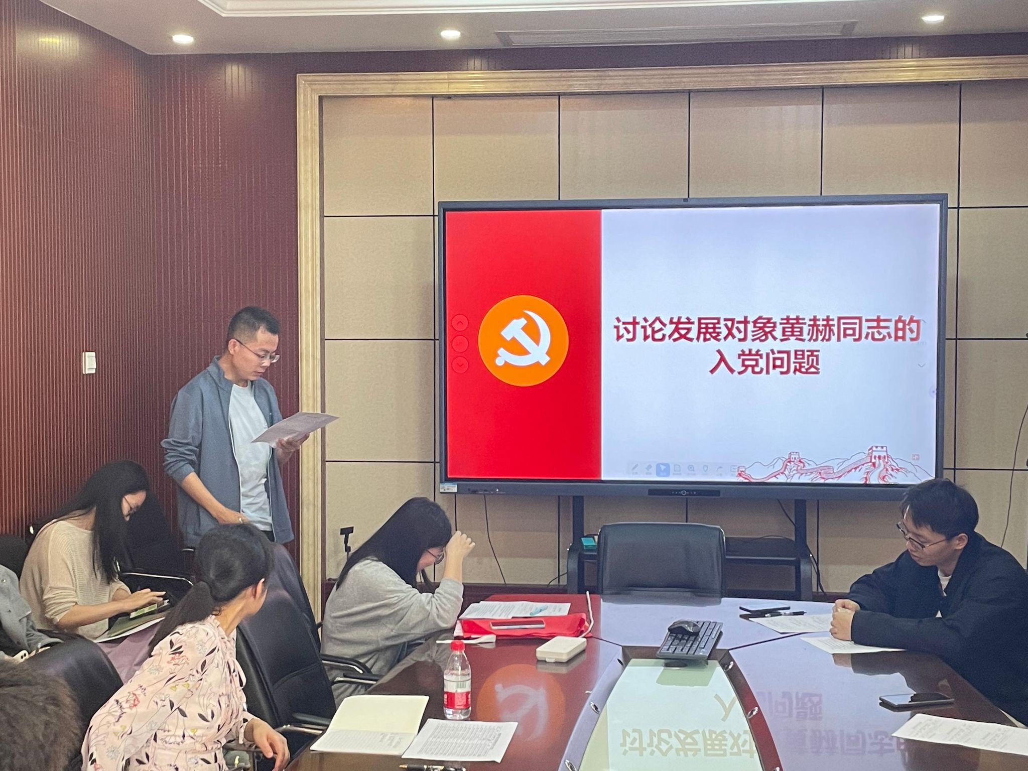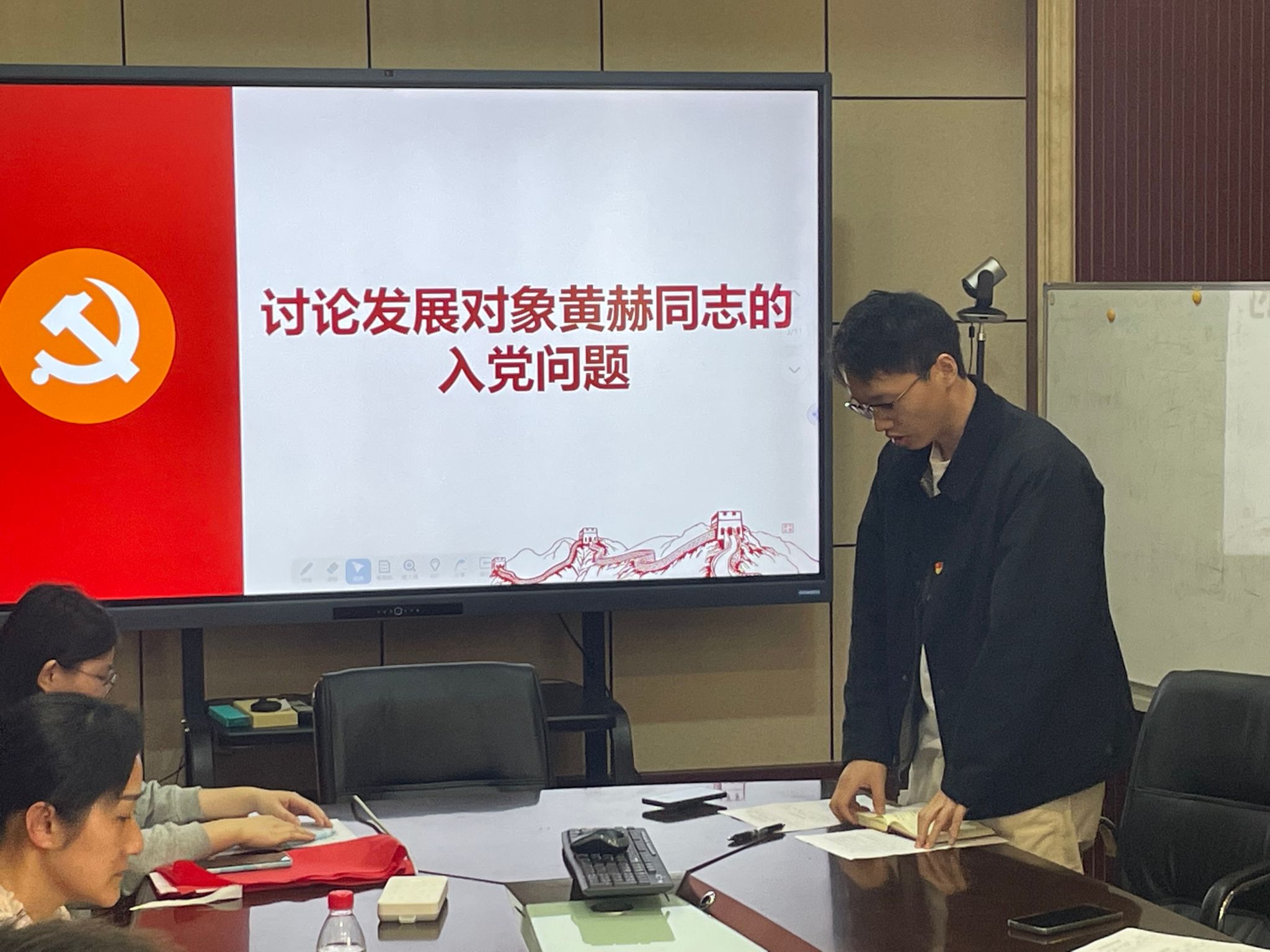 会议第一项,预备党员接收大会,讨论发展对象黄赫、崔垚、帅逸飞同志的入党问题。首先,三位发展对象同志详细汇报自身对党的认识、入党动机、本人履历,表达自己入党的决心。入党介绍人分别对发展对象的培养考察情况作了详细介绍,均表示同意吸收他们成为预备党员。支部书记胡艺川同志向支部大会报告各位发展对象综合政治审查情况,最后与会党员进行充分讨论,均对三位同志的表现给予了肯定。