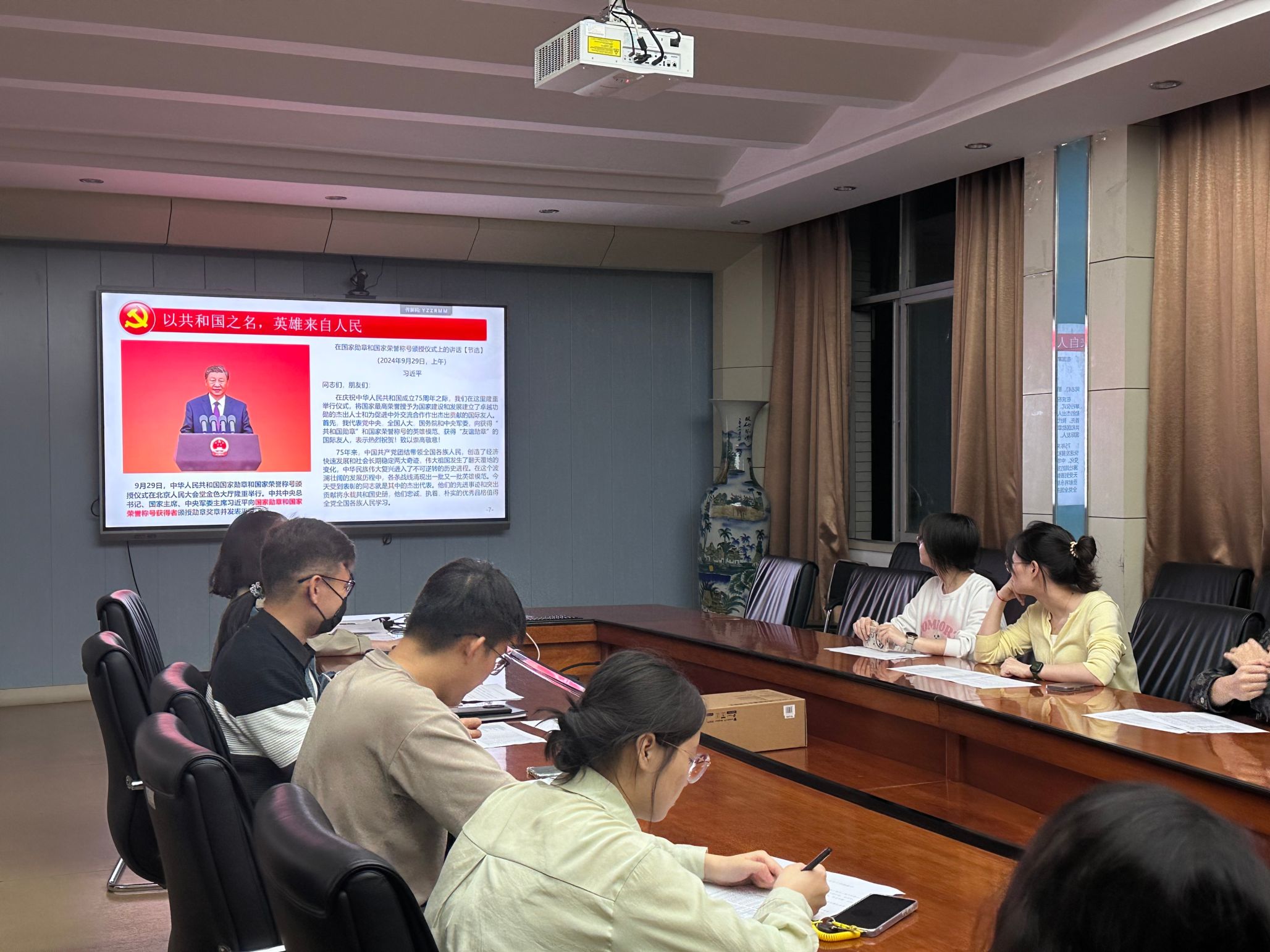 会议第三项:支部开展主题为“以共和国之名,英雄来自人民”的十月主题党日活动。9月29日,中华人民共和国国家勋章和国家荣誉称号颁授仪式在北京人民大会堂金色大厅隆重举行。中共中央总书记、国家主席、中央军委主席习近平向国家勋章和国家荣誉称号获得者颁授勋章奖章并发表重要讲话,深刻阐述了英雄精神的时代价值与人民力量的伟大。