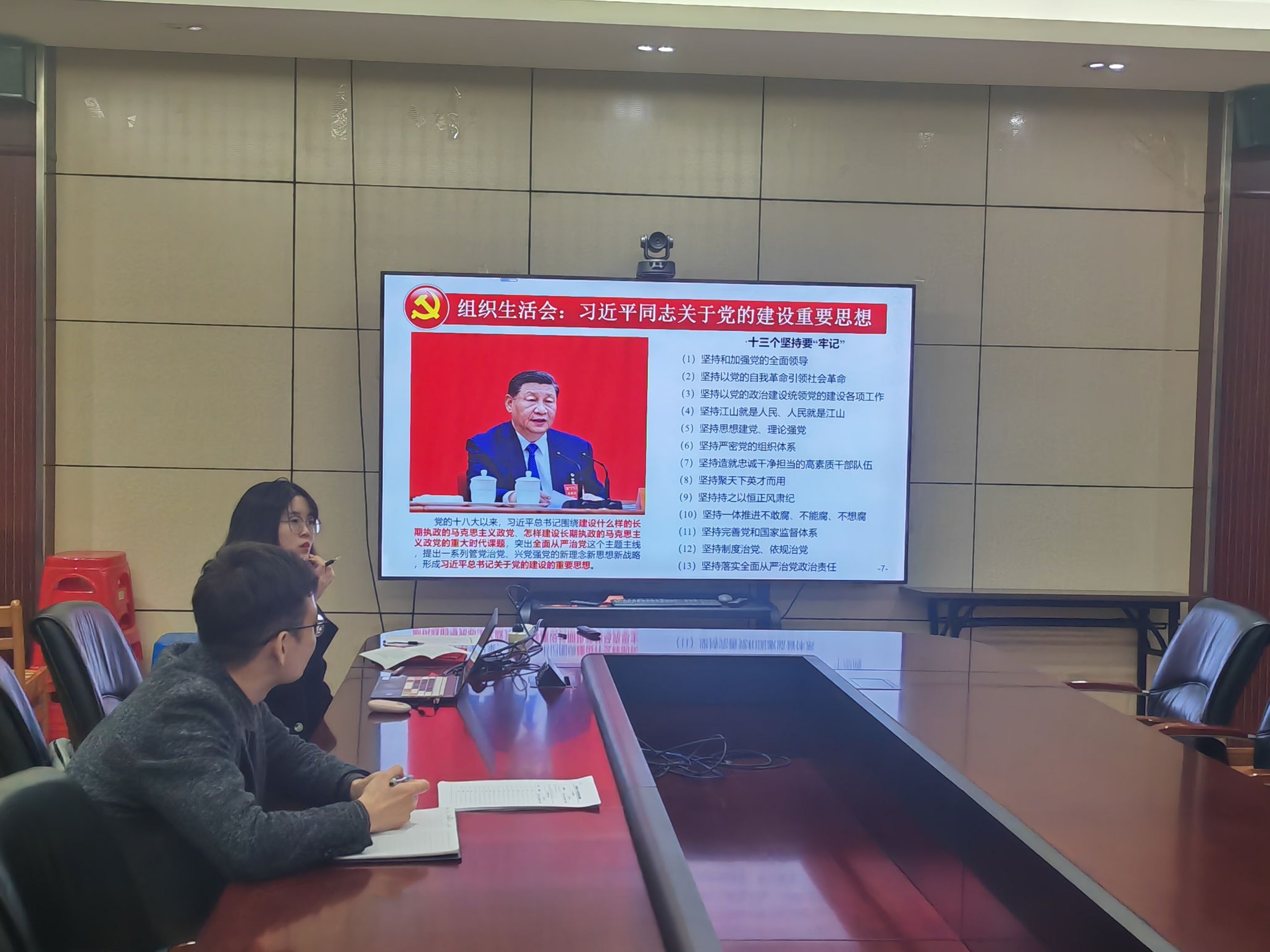 会议第二项,党支部书记傅梦静同志带领大家学习习近平总书记关于党的建设的重要思想。