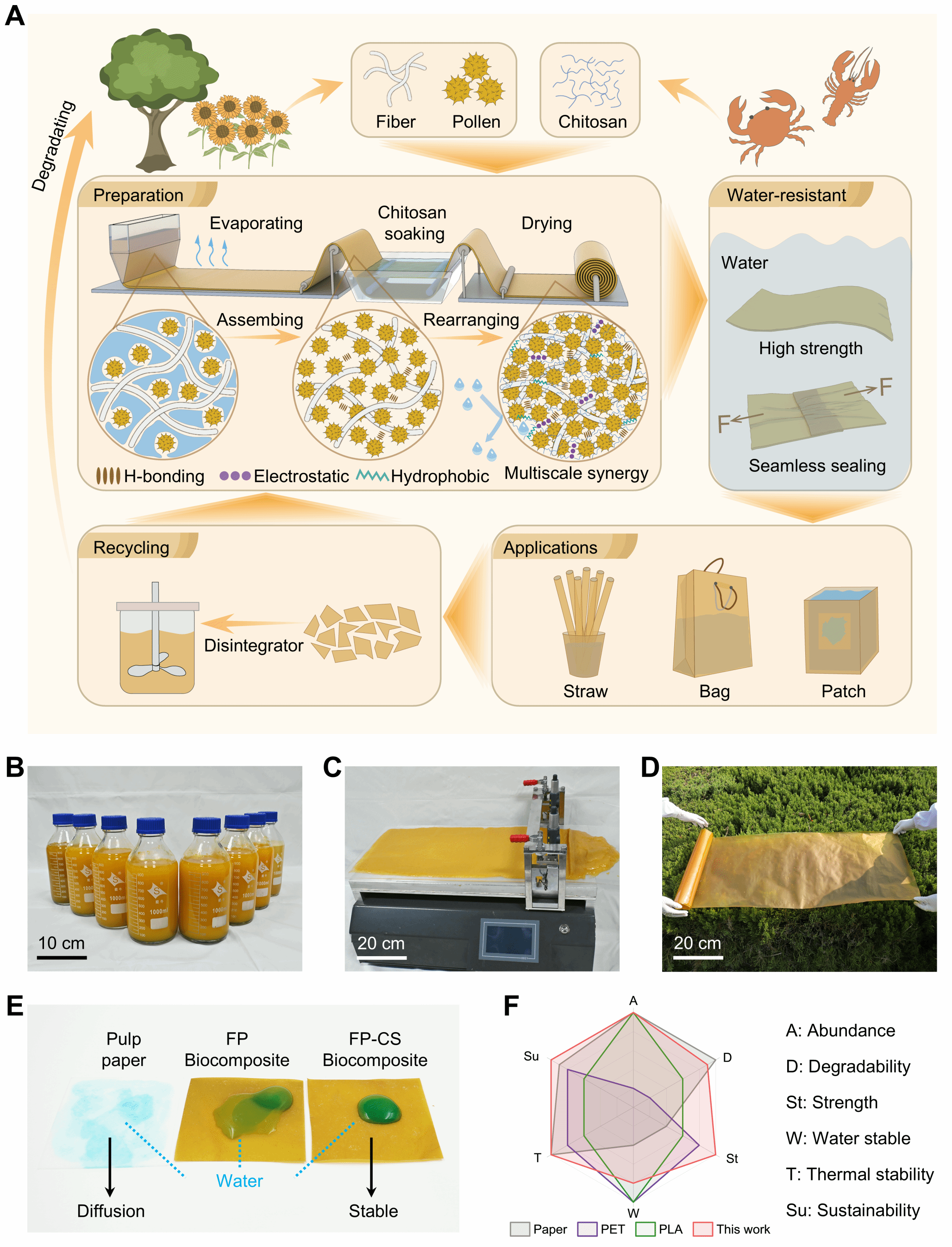 针对这一挑战,团队提出了一种基于多尺度自发组装与重组的生物质协同构筑策略。研究巧妙结合三种天然生物质组分的理化结构互补性:纤维素纤维提供结构骨架、花粉微凝胶颗粒作为自适应界面填充剂、壳聚糖发挥分子粘合与密封作用。三者协同作用形成分级网络结构,实现了力学强度与耐水性能的同步提升。该材料不仅具备高强度与防水性,且完全可生物降解,制备过程无需高能耗或化学改性,充分体现绿色可持续理念。得益于壳聚糖的粘合特性,材料表面可实现无缝防水密封,在食品包装、可降解吸管、防水贴片等领域展现出广阔应用前景。研究成果为废弃生物质高值化利用提供了新思路,也为塑料污染治理与循环经济发展贡献了创新方案。