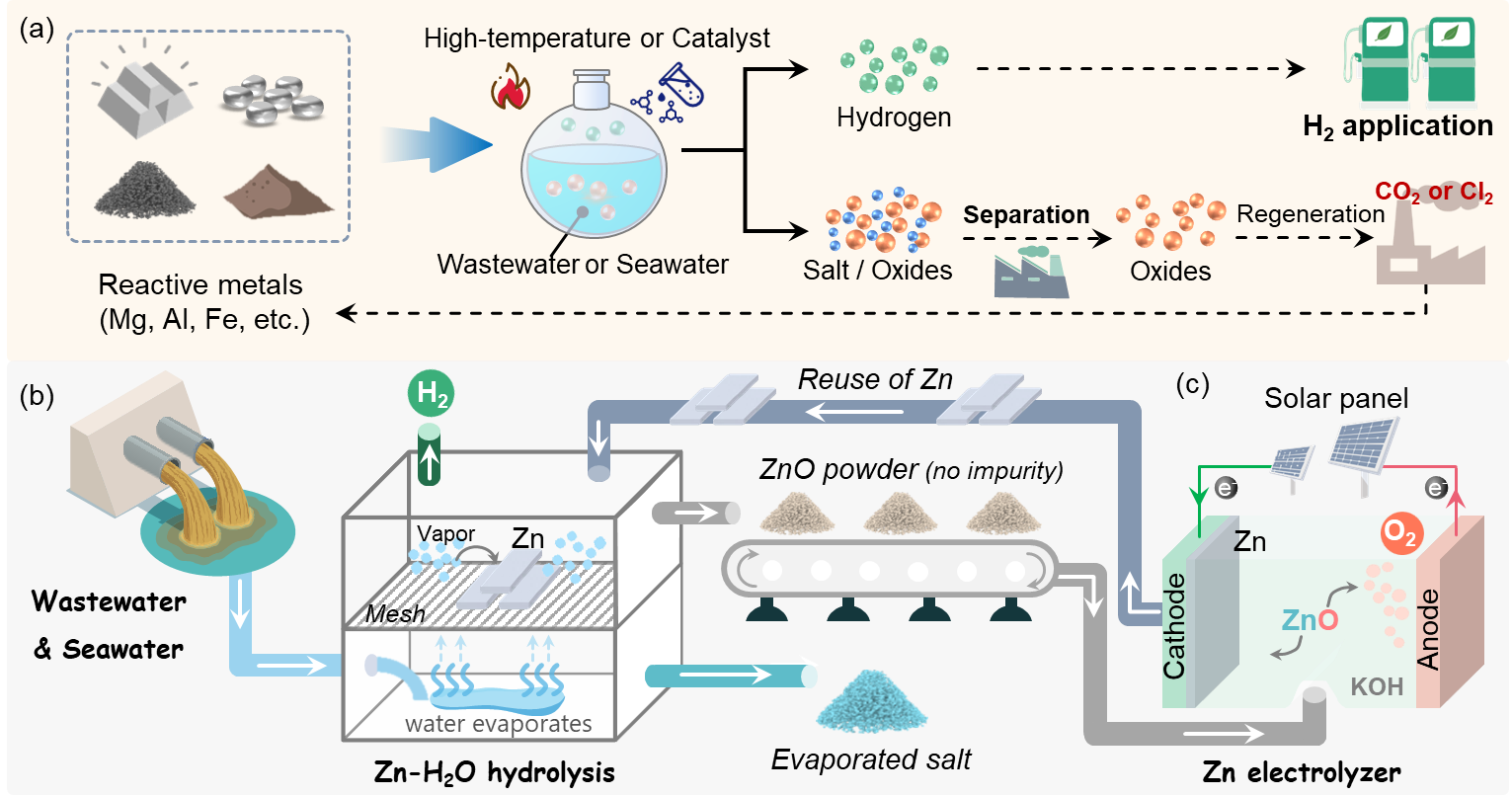 当前海水和含盐废水的资源化利用和绿色处理存在流程长(需要纯化)、成本高(电解需要贵金属催化剂)和技术不成熟(对不同水质的适应性不强)的挑战。因此,开发能够直接利用含盐水源制氢和资源提取的技术具有重要意义。为此,研究团队提出了一种“水解制氢-电解再生”的闭环循环系统,通过“空间分离”的反应设计实现多产物的高效分离。在水解产氢环节,团队将反应器分为上下两层。上层放置锌,下层为海水或废水。加热反应器至250°C,下层水/有机污染物蒸发为蒸汽上升,与锌反应生成高纯氢气(>99.7%)和固体氧化锌(Zn + H2O (g) → ZnO + H2↑)。产生的氢气从气管收集,氧化锌留在上层,而水中的盐分则在下层浓缩结晶,实现了H2、ZnO和盐分的自动三相分离。在电解再生环节,将水解产生的ZnO置于电解槽中进行电化学还原(ZnO + H2O + 2e- → Zn + 2OH-),即可再生出金属锌,返回第一步循环使用。