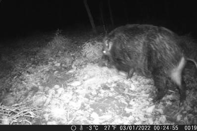 (a)野外放置红外相机(b)红外相机自动拍摄到凌晨经过的野猪