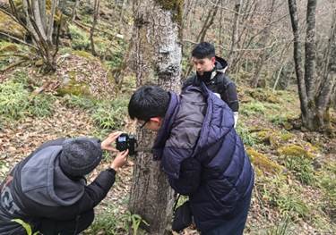 12月21日上午,保护区工作人员马文虎老师向师生们介绍了唐家河的生态环境及主要物种。马老师在保护区工作30多年,多次参与大熊猫样线调查、扭角羚种群和川金丝猴种群等多项调查,曾十余次目击野生大熊猫。他主动申请完成一些位置偏远、条件艰苦的样线,积累了多年野保一线工作经验,形成了一套自己的野生动植物知识体系,练就了一身野外工作的“特殊技能”。随后,师生们在马老师的带领下前往山区深处。在他指引下,一路观测到了大量的野生动物,包括扭角羚、金雕等国家一级保护动物,亲眼观察到他们的行为与栖息环境。马老师介绍了保护区不同动物种群一年四季中的分布区域以及与海拔、气温等因素的关系,指出了保护区周边开矿等人类活动对动物分布的显著影响。