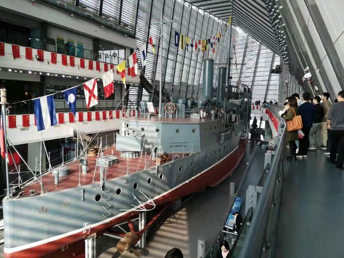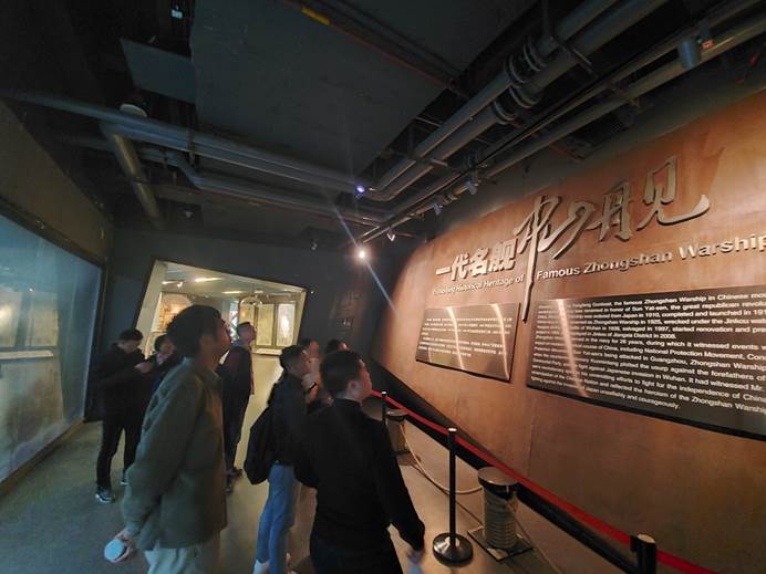 中山舰博物馆坐落于其在1938年武汉会战中的蒙难地—金口镇。中山舰博物馆由两幢相连建筑构成,舰体陈列厅全钢结构,外形如同一艘战舰,头冲金鸡湖,好似欲扬帆出海,中山舰就稳稳安放其中。中山舰是以近代民主革命先行者孙中山先生名字命名的“一代名舰”,从1912年中山舰建成下水,之后参与“广州平乱”,再到为纪念中山先生而更名,最终于抗日战争中为国蒙难,直至上世纪末的重见天日,它见证了一代革命先烈为追求国家独立和民族解放而前赴后继、铁血悲歌的革命历程。在讲解员对展厅陈列的中山舰舰体的细致讲述中,同时观看着斑驳舰体,全体党员都深刻感受到了中山舰当年所经历的残酷战事和全体舰员们所经历的可歌可泣的英雄故事。