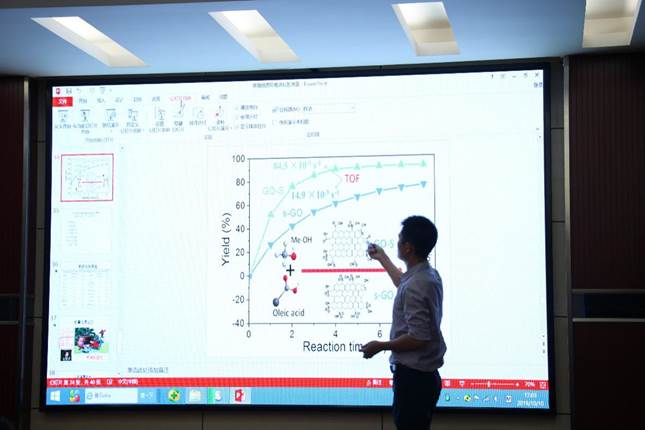 的博士后张洪雷博士的报告分为两部分,一部分以“碳材料维度结构和表面官能团含量对碳基固体催化剂催化活性的协同增效作用”为主题进行讲述,另一部分是张洪雷博士分享了自己这些年对科研的一些人生感悟。