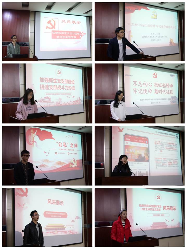 本次研究生党支部风采大赛包括初评和现场展示两个环节。经过对各党支部提交的工作案例材料进行初步评选,共有八个党支部进入现场展示环节。在现场展示的过程中,每个党支部都在短短的时间内对本支部的特色活动和成员风采进行了充分展示。土地资源管理专业2017级硕士研究生党支部展示了歌曲《我们都是追梦人》的手势舞,地图制图学与地理信息工程专业2017级硕士研究生联合党支部结合学习强国APP进行了历史重演……各党支部的风采展示形式多样,各具特色。同时各支部还在学习贯彻习近平新时代中国特色社会主义思想和党的十九大精神,学习领会习近平总书记关于加强党的政治建设、教育工作等重要论述下的背景下,对 “不忘初心扬红船精神,牢记使命踏时代征程”的主题进行了微党课展示,充分体现了色情直播app