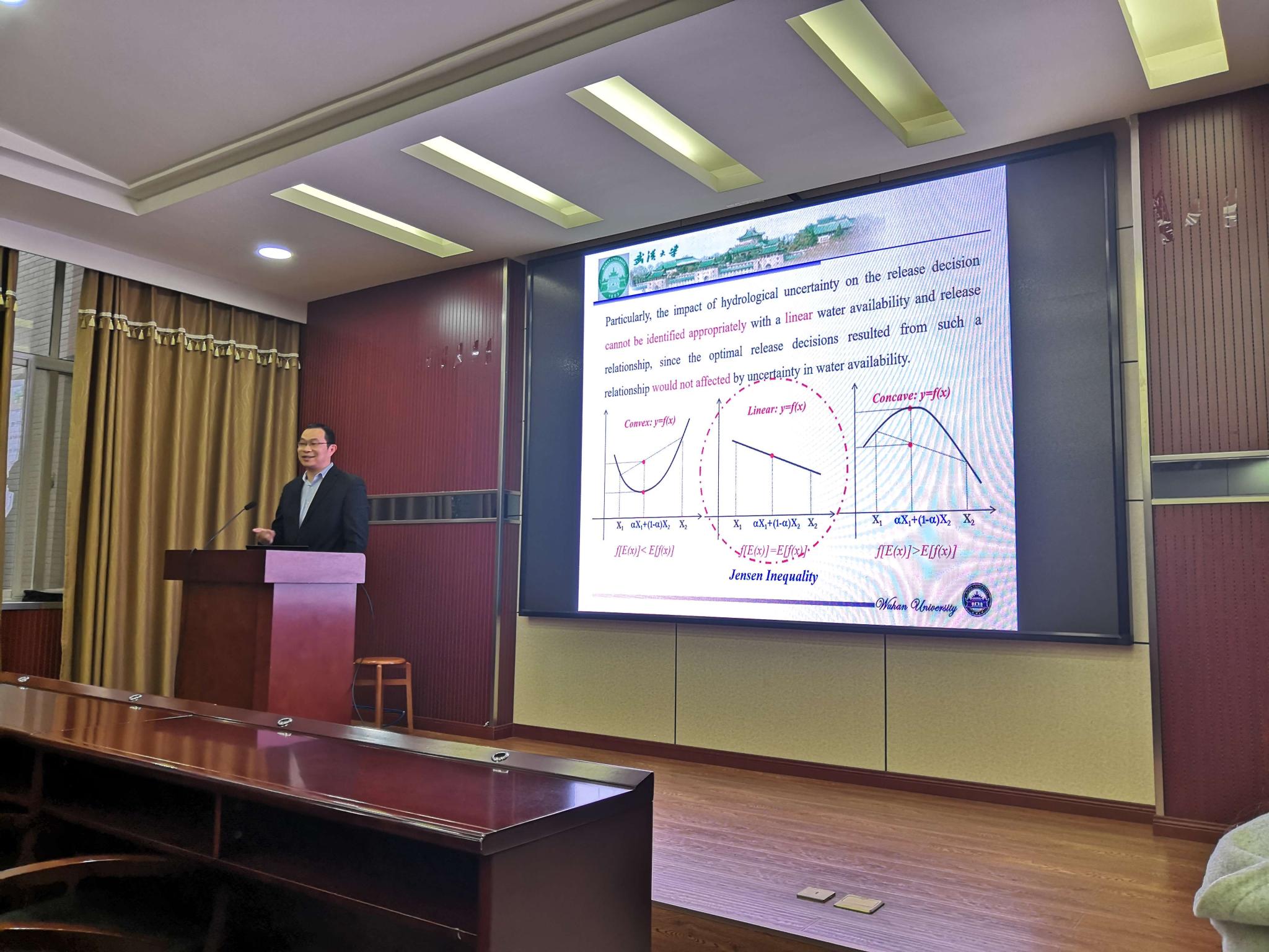 随后,曾老师运用边际效用相等原理,以损失最小为原则提出了一个计算当前供水与余留储蓄的关系的两阶段模型,并以运用此模型明确了选择凹凸决策与线性决策的标准,以及在不确定情况下资源的分配方式。然后,曾老师提出了在库容有限等约束条件下,如何综合运用多种决策模型调节水源供给,以及不同决策模型的启动标准与终止标准。
